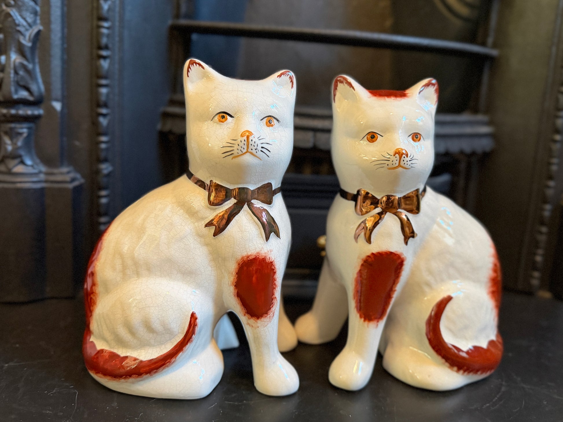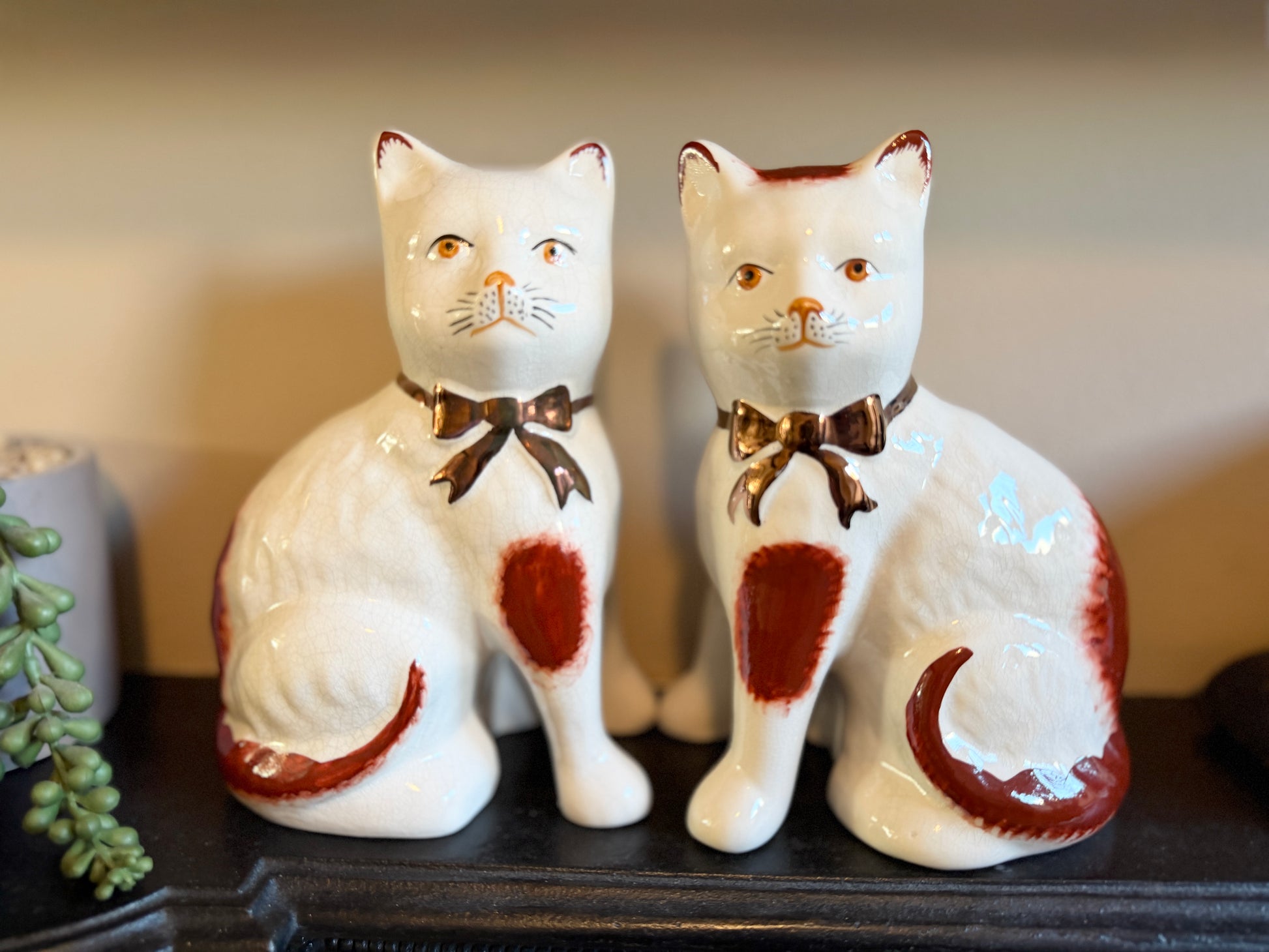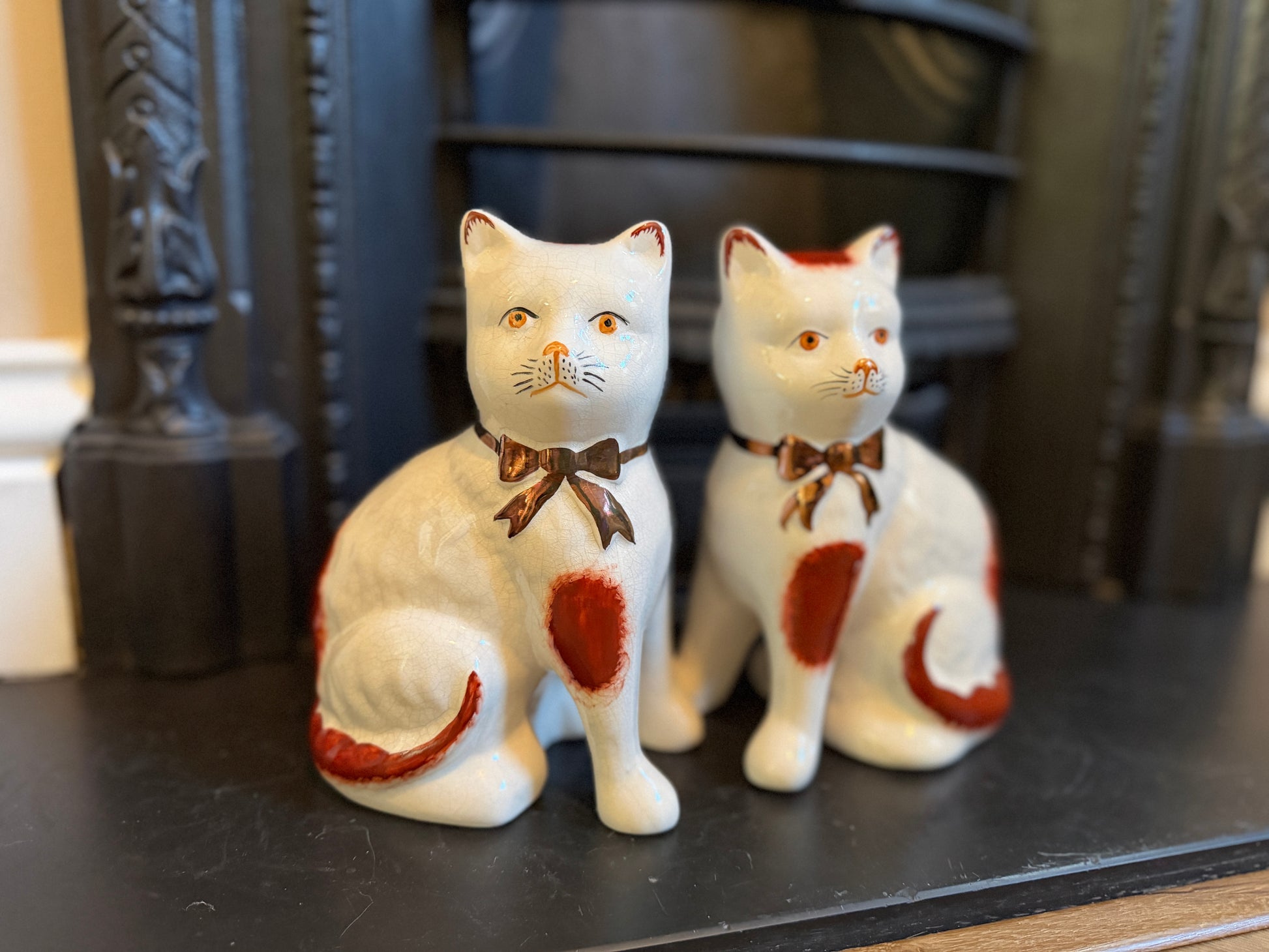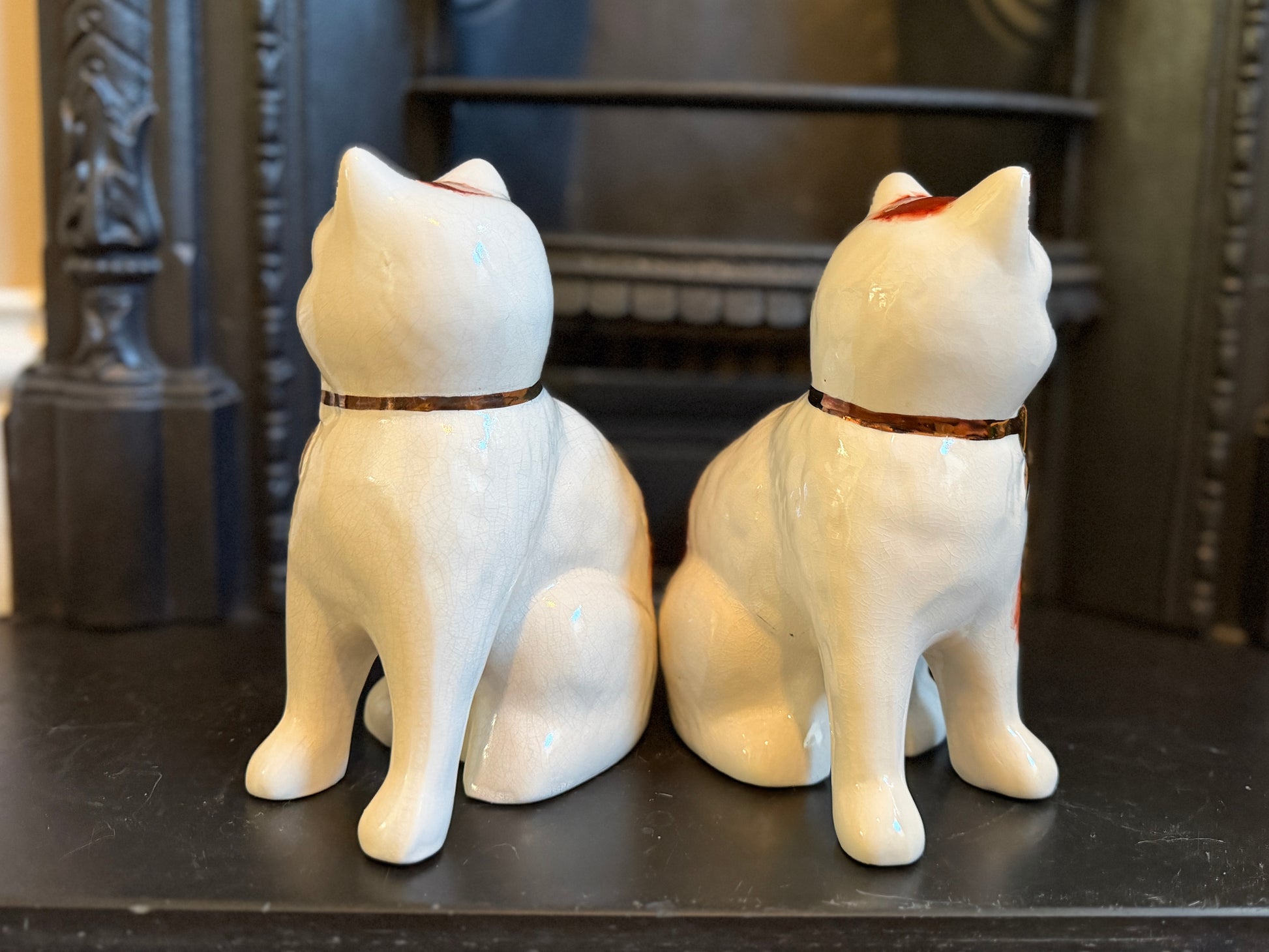 艶やかな仕上がりと手描きの個性、そしてどこか温かみのある表情が魅力のこのペアは、玄関やサイドボード、ブックシェルフなどに飾ると、空間に英国らしい上品さと柔らかな彩りを添えてくれます。猫モチーフをお探しの方や、インテリアにユニークなポイントを加えたい方におすすめです。