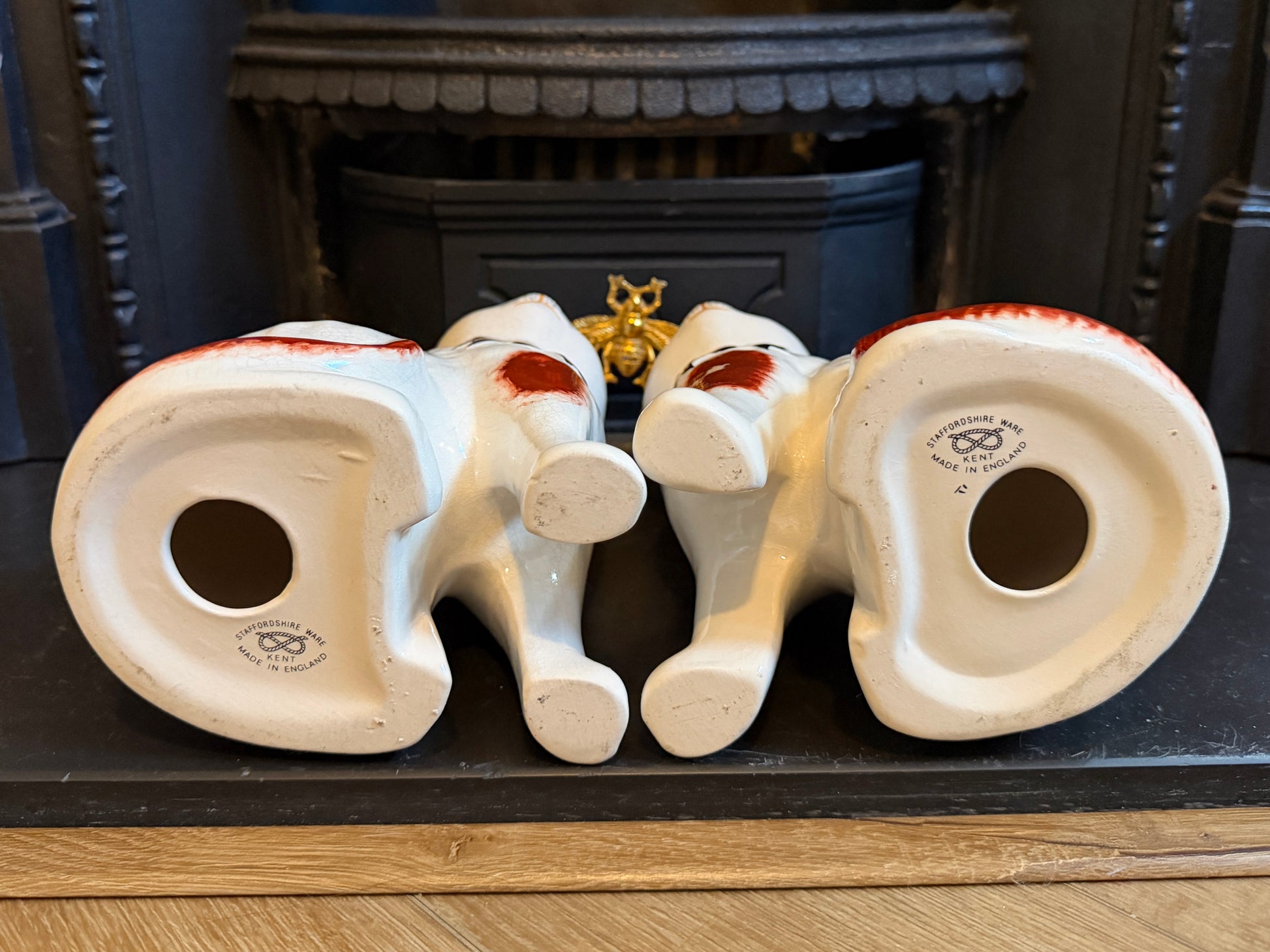 底面には「Staffordshire Ware Kent Made in England」とスタッフォードシャーノット入りのバックスタンプが入り、同社の正統な作品であることが分かります。1894年創業のウィリアム・ケント社は、犬や猫、フラットバックオーナメントなど多くのスタッフォードシャーウェアを生み出したメーカーで、1962年の閉窯まで英国陶器の歴史に大きな足跡を残しました。