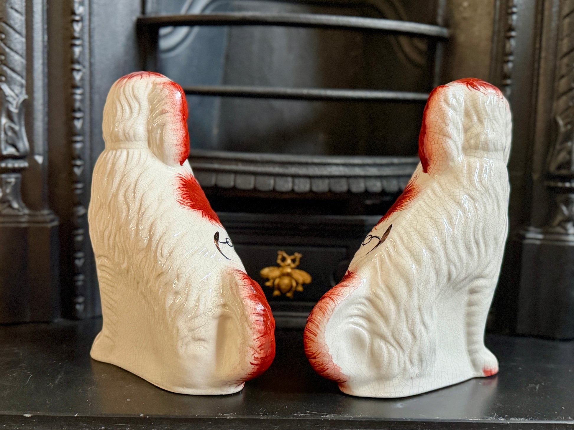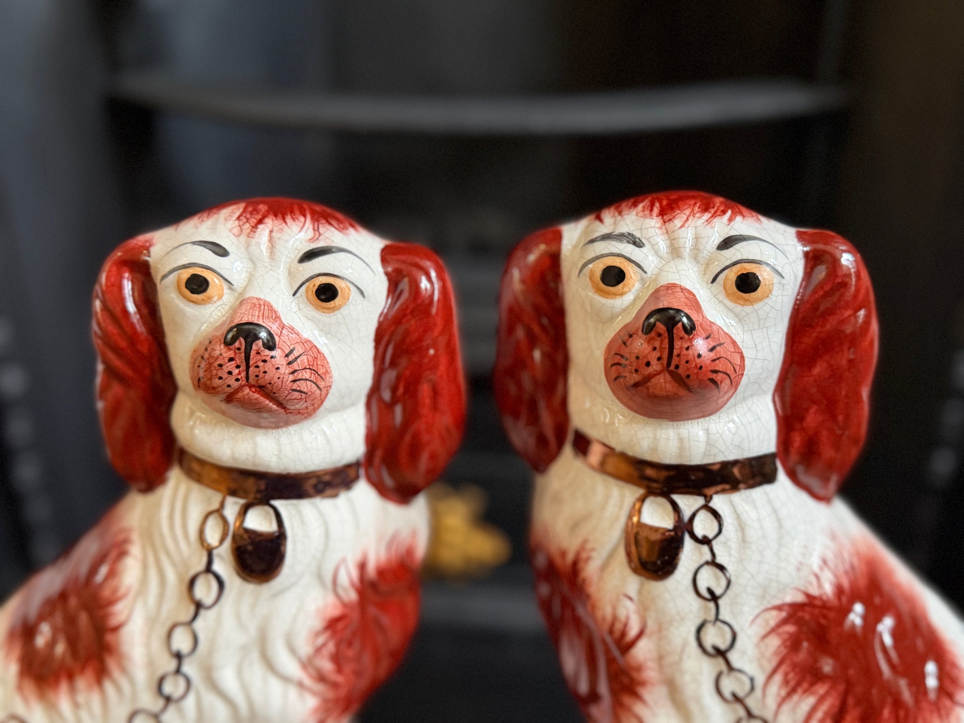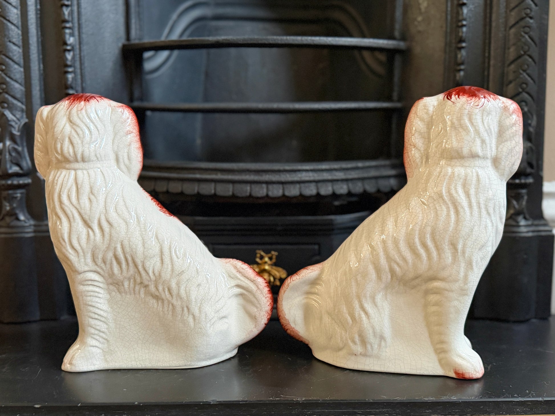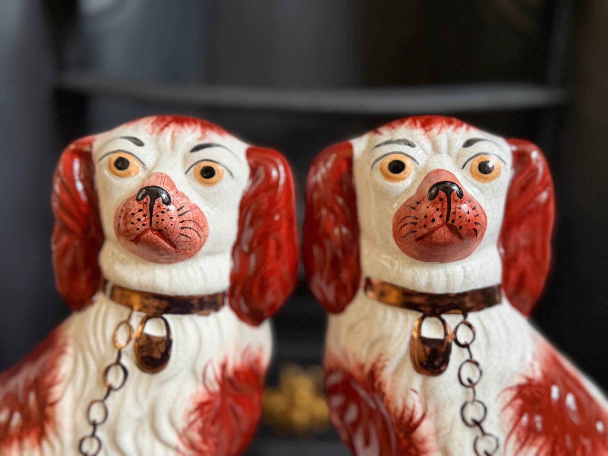 こちらは、ウィリアム・ケント(William Kent)によるヴィンテージのスタッフォードシャードッグのペアです。1940〜1950年代頃に製作されたもので、赤いマズルとぱっちりとした大きな瞳がとてもチャーミングな印象の一対です。くっきりとしたレッドの毛並み表現やつややかな耳のペイントに温かみがあり、クラシックな佇まいの中にどこか親しみのある表情をたたえたペア。インテリアのアクセントとしても取り入れやすいデザインです。見るたびにどこか和ませてくれる、可愛らしく親しみのある雰囲気も魅力です。