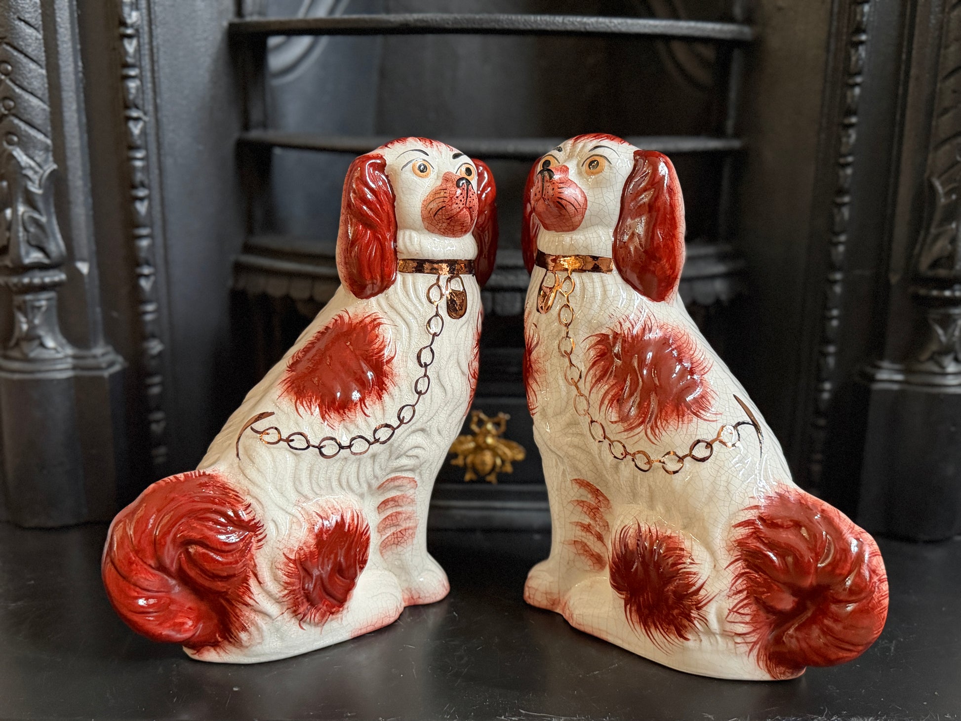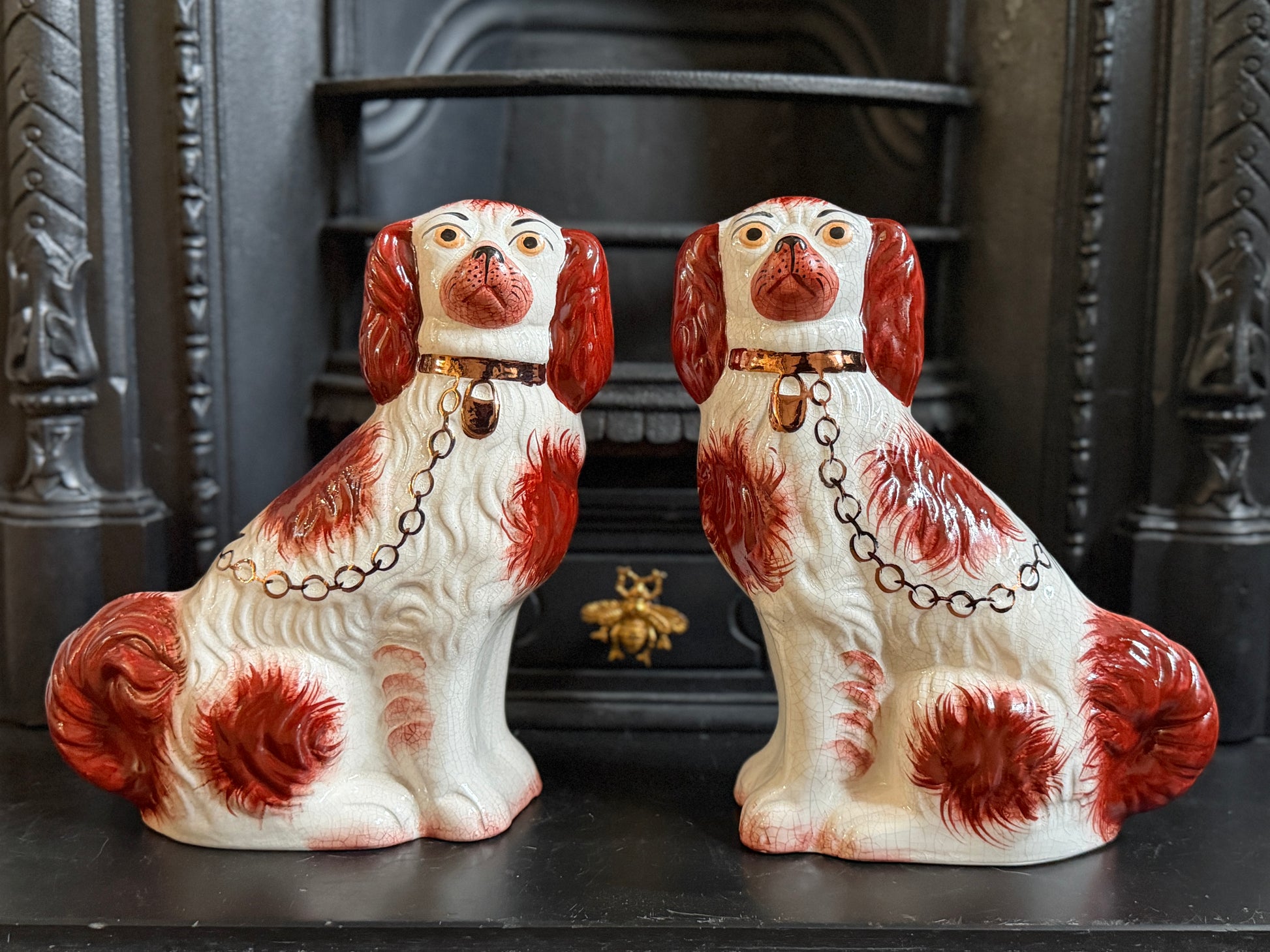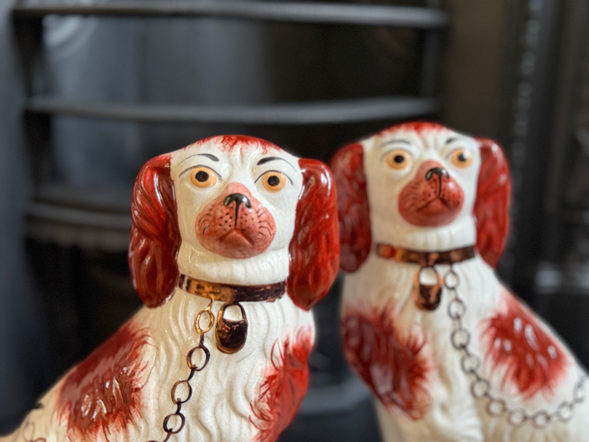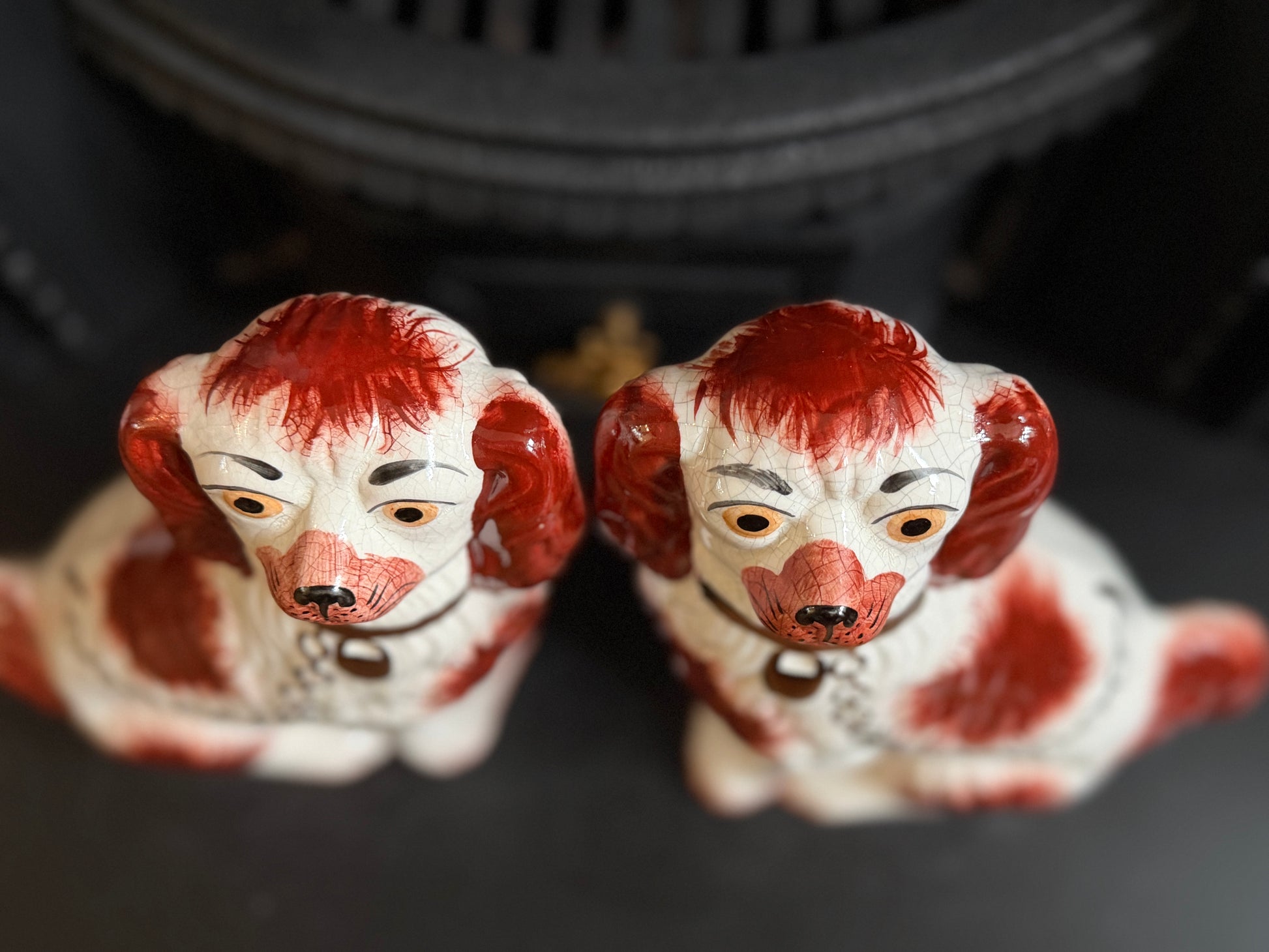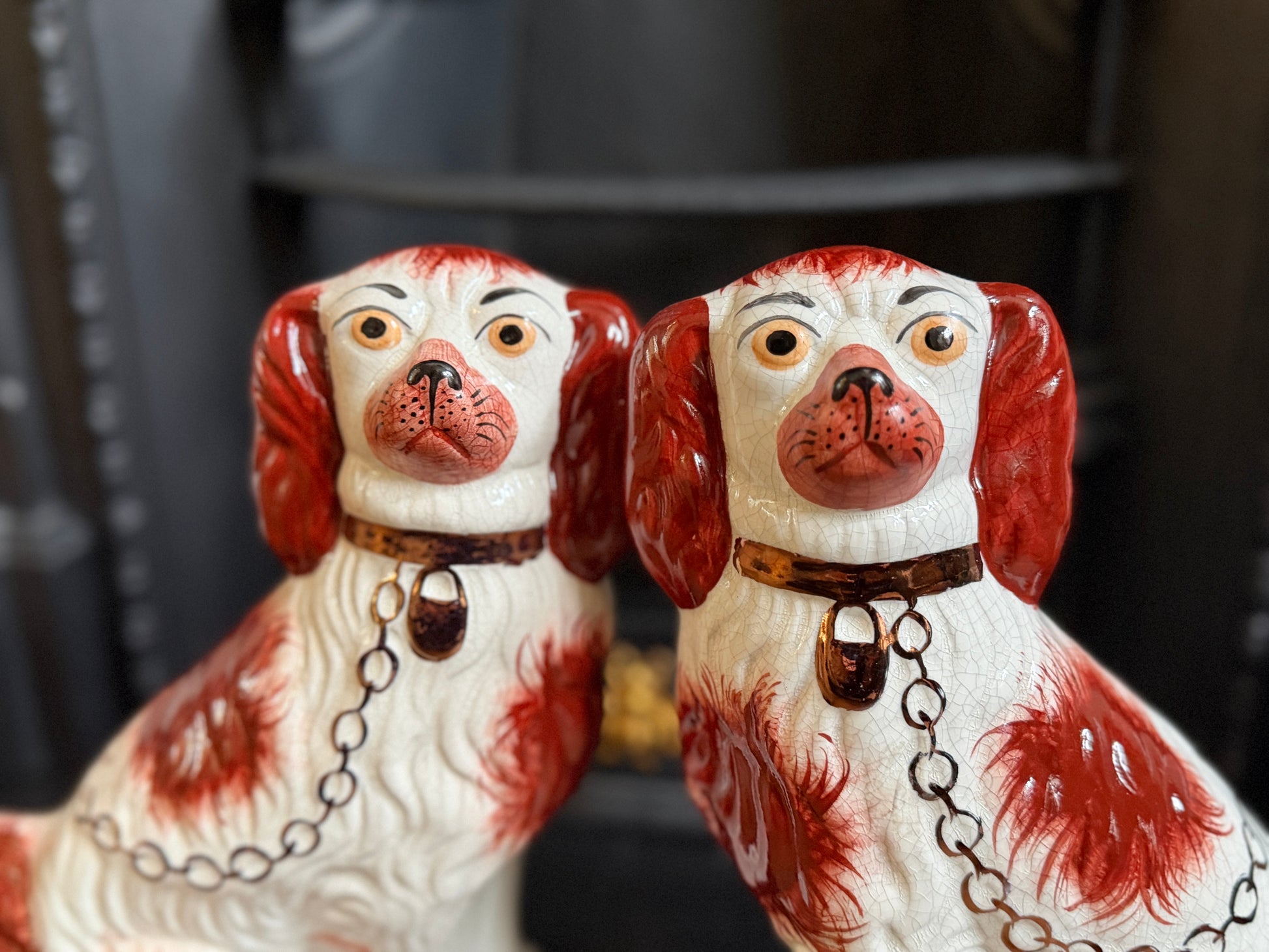 こちらは、ウィリアム・ケント(William Kent)によるヴィンテージのスタッフォードシャードッグのペアです。1940〜1950年代頃に製作されたもので、赤いマズルとぱっちりとした大きな瞳がとてもチャーミングな印象の一対です。くっきりとしたレッドの毛並み表現やつややかな耳のペイントに温かみがあり、クラシックな佇まいの中にどこか親しみのある表情をたたえたペア。インテリアのアクセントとしても取り入れやすいデザインです。見るたびにどこか和ませてくれる、可愛らしく親しみのある雰囲気も魅力です。