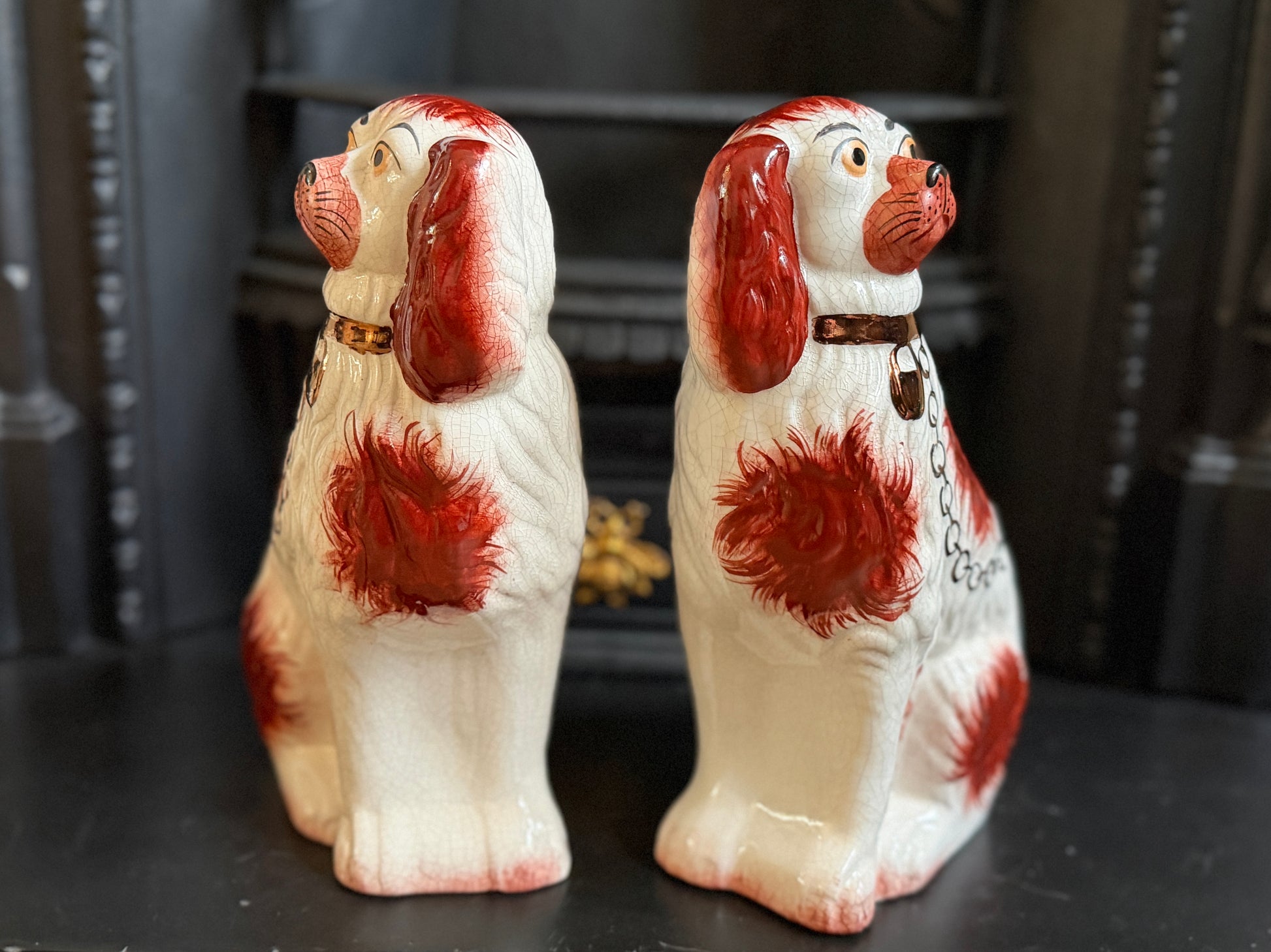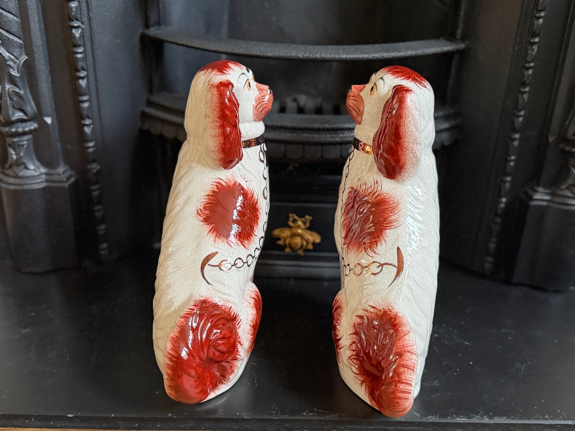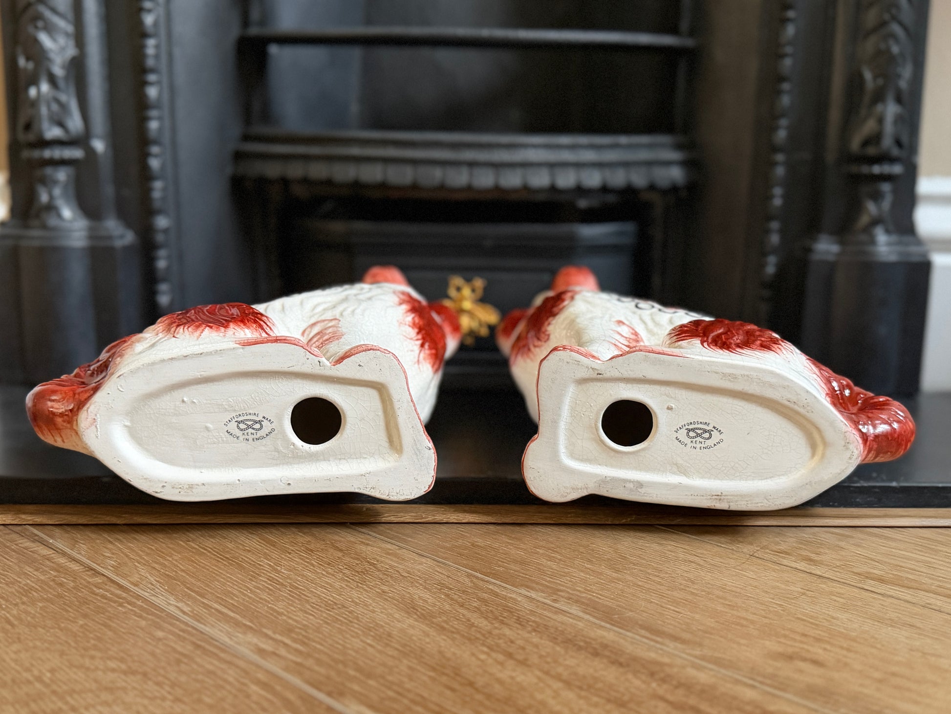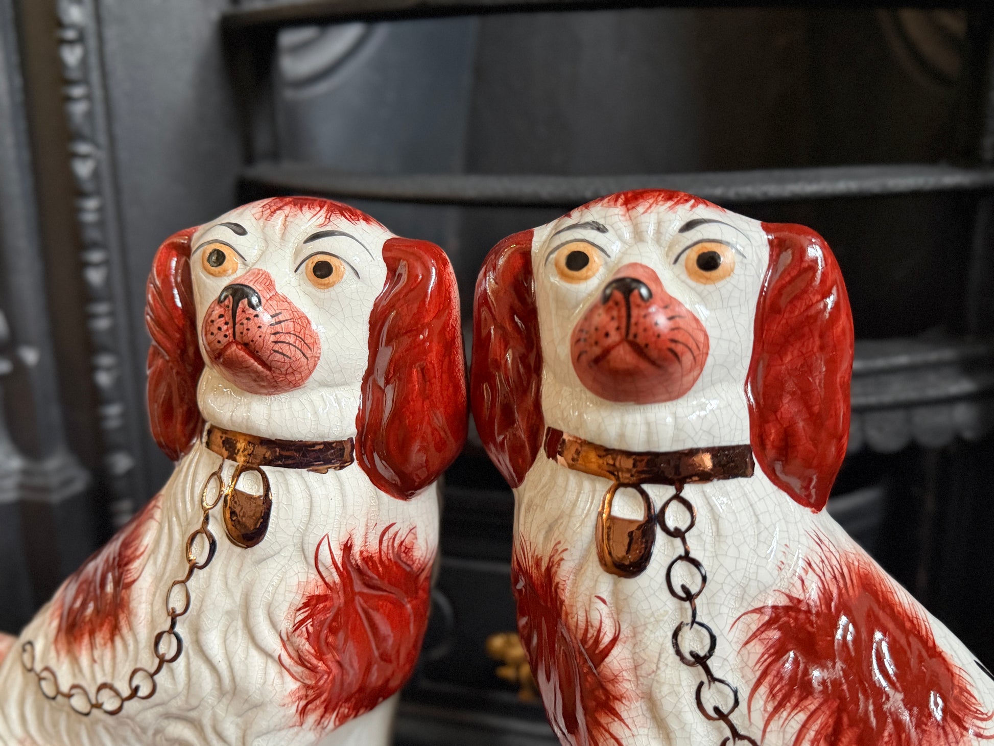 こちらは、ウィリアム・ケント(William Kent)によるヴィンテージのスタッフォードシャードッグのペアです。1940〜1950年代頃に製作されたもので、赤いマズルとぱっちりとした大きな瞳がとてもチャーミングな印象の一対です。くっきりとしたレッドの毛並み表現やつややかな耳のペイントに温かみがあり、クラシックな佇まいの中にどこか親しみのある表情をたたえたペア。インテリアのアクセントとしても取り入れやすいデザインです。見るたびにどこか和ませてくれる、可愛らしく親しみのある雰囲気も魅力です。