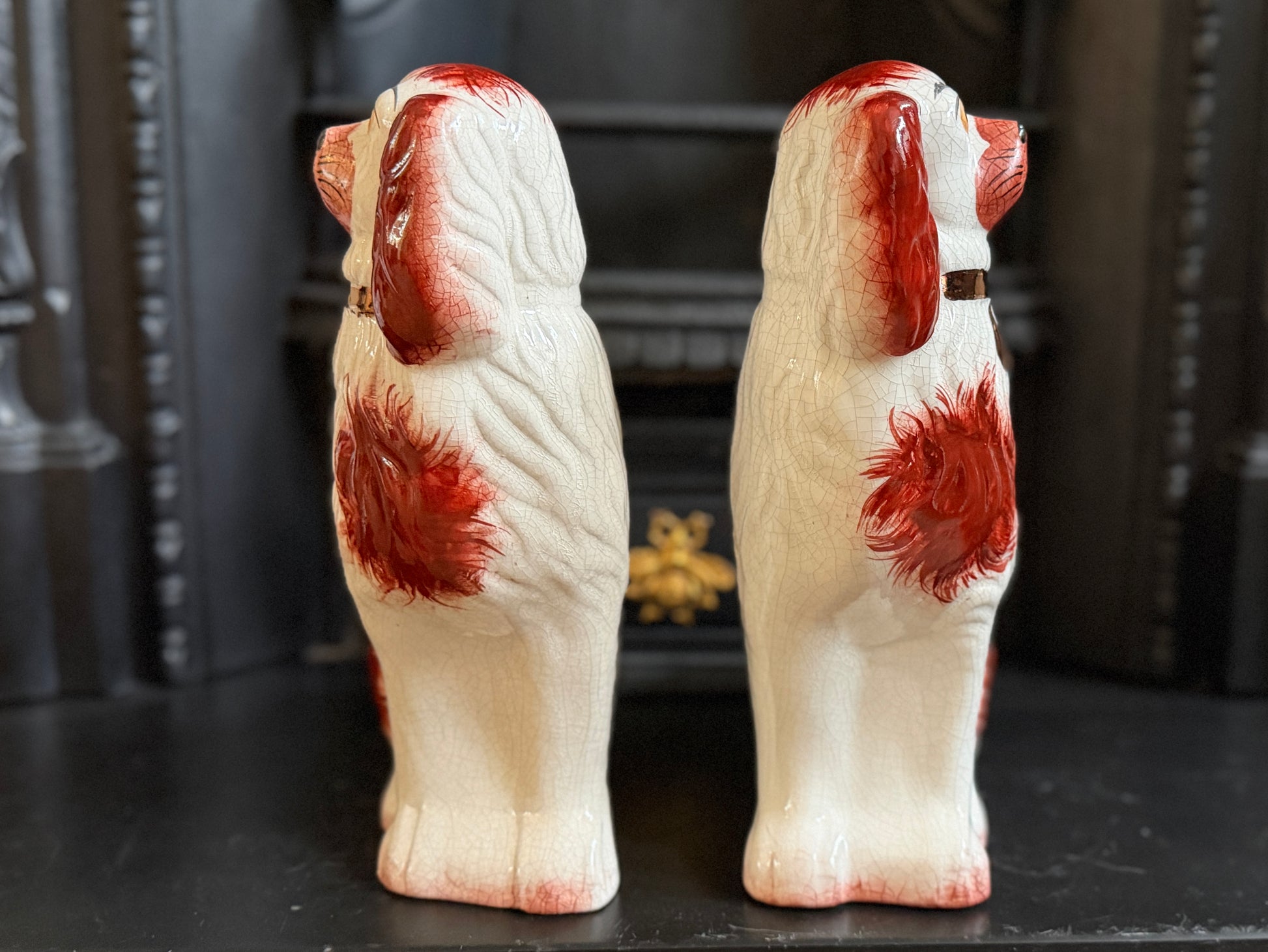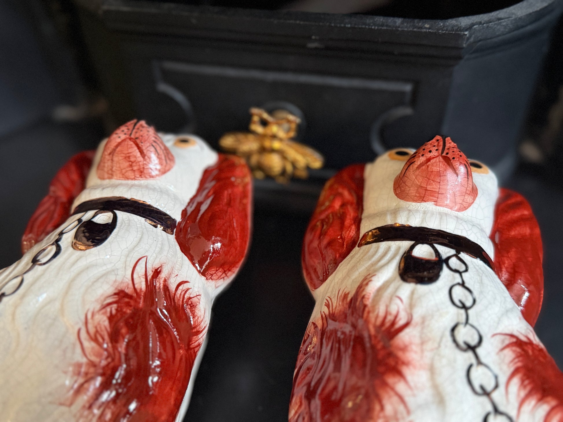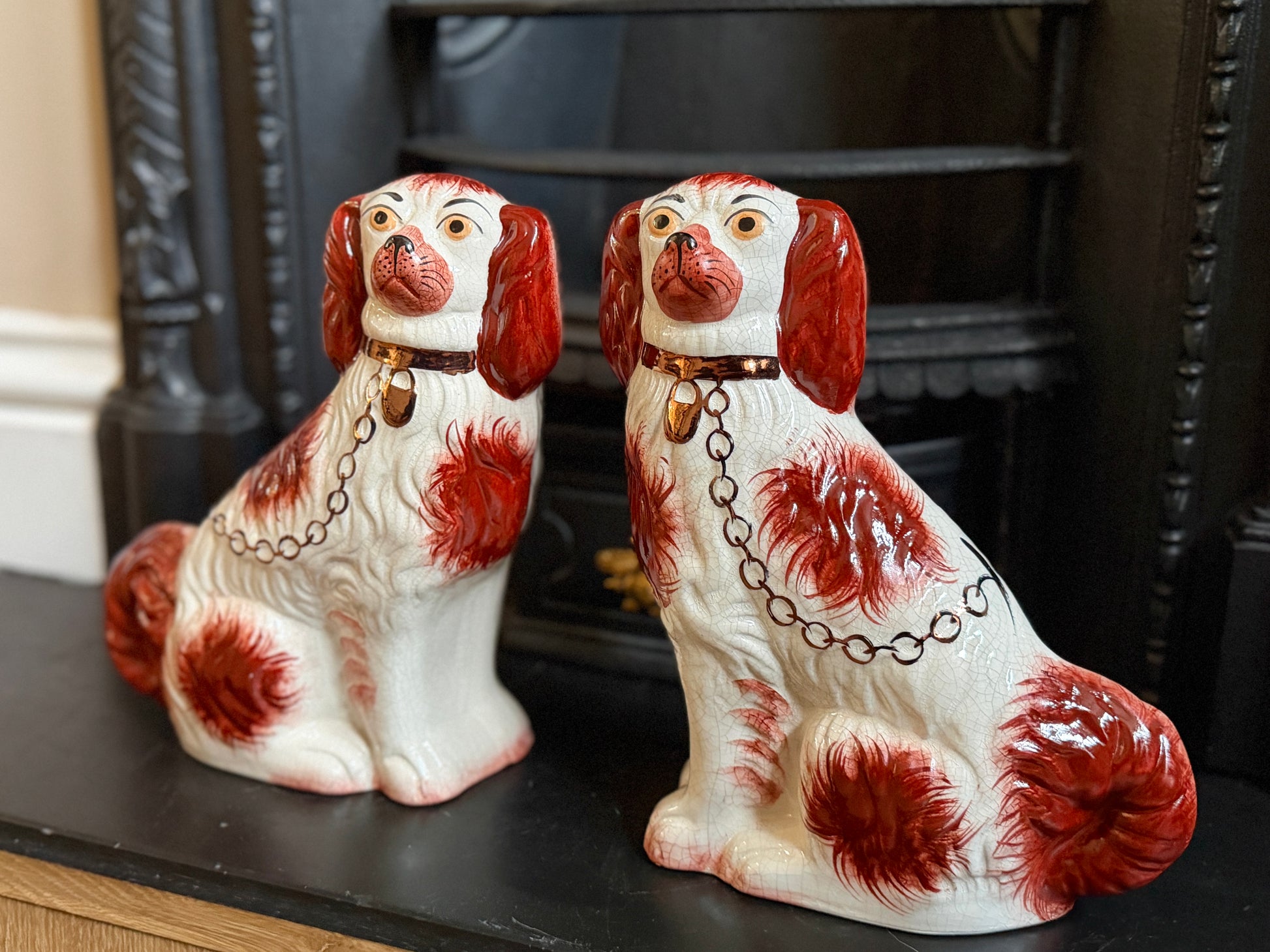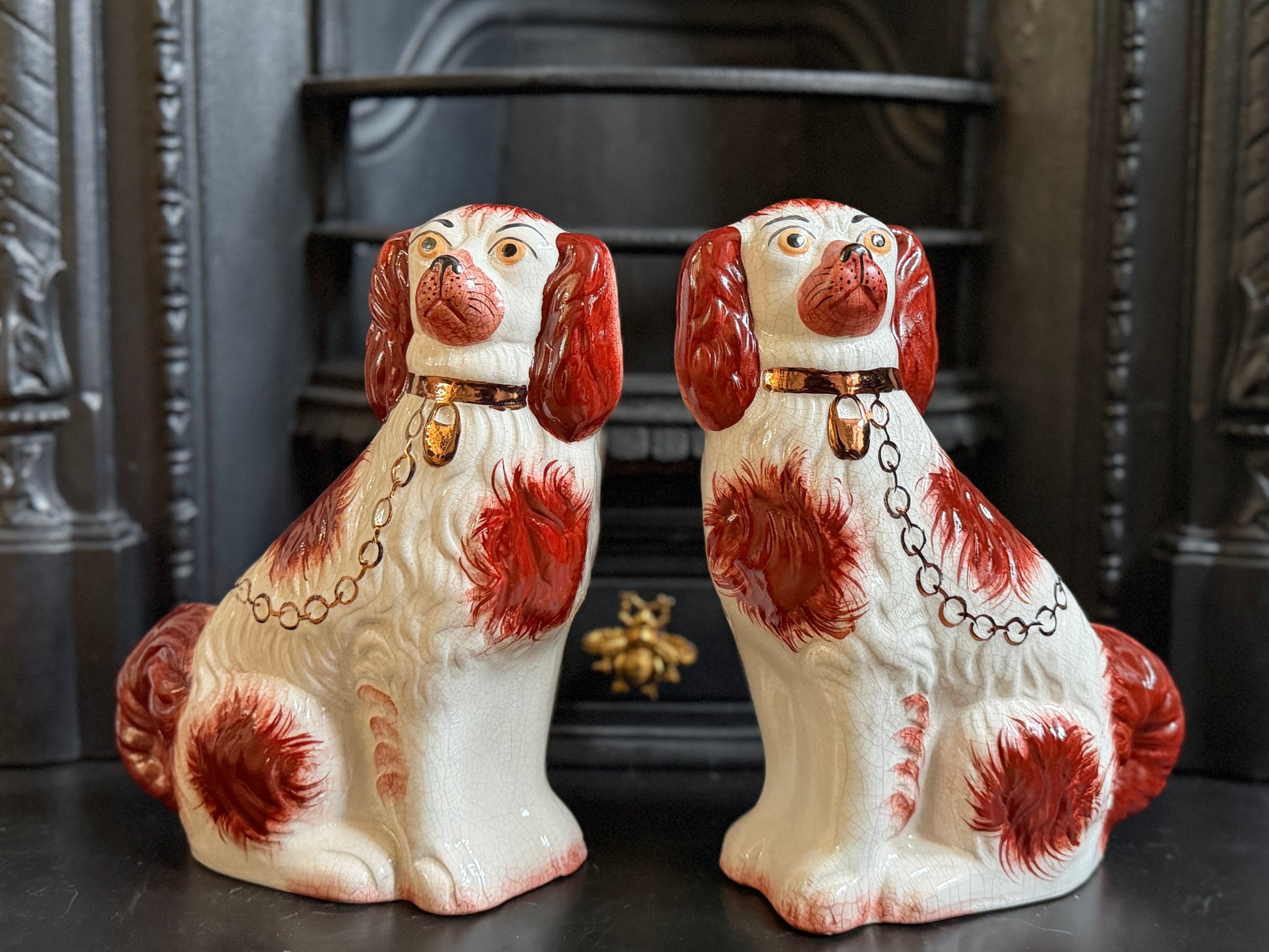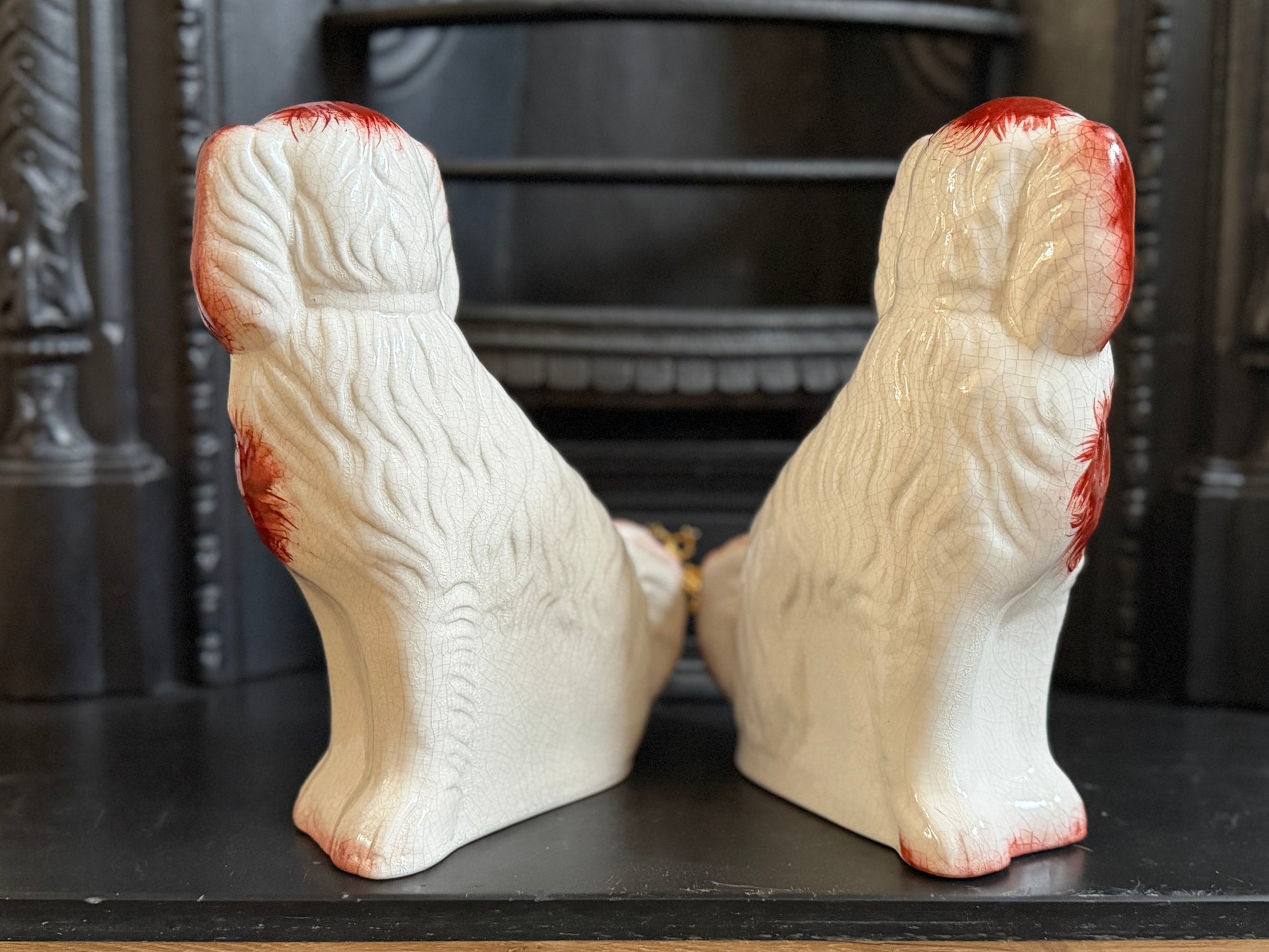 こちらは、ウィリアム・ケント(William Kent)によるヴィンテージのスタッフォードシャードッグのペアです。1940〜1950年代頃に製作されたもので、赤いマズルとぱっちりとした大きな瞳がとてもチャーミングな印象の一対です。くっきりとしたレッドの毛並み表現やつややかな耳のペイントに温かみがあり、クラシックな佇まいの中にどこか親しみのある表情をたたえたペア。インテリアのアクセントとしても取り入れやすいデザインです。見るたびにどこか和ませてくれる、可愛らしく親しみのある雰囲気も魅力です。
