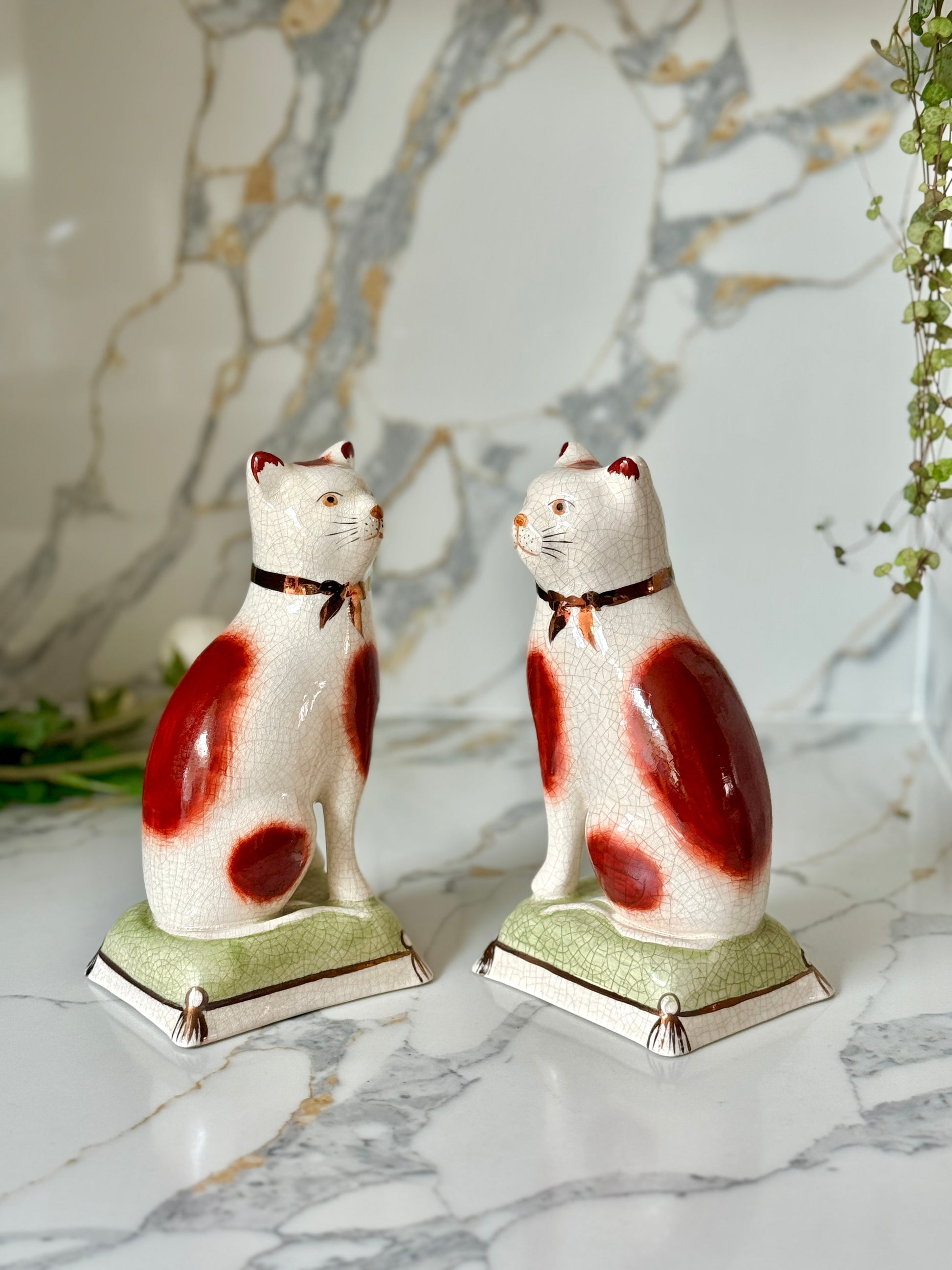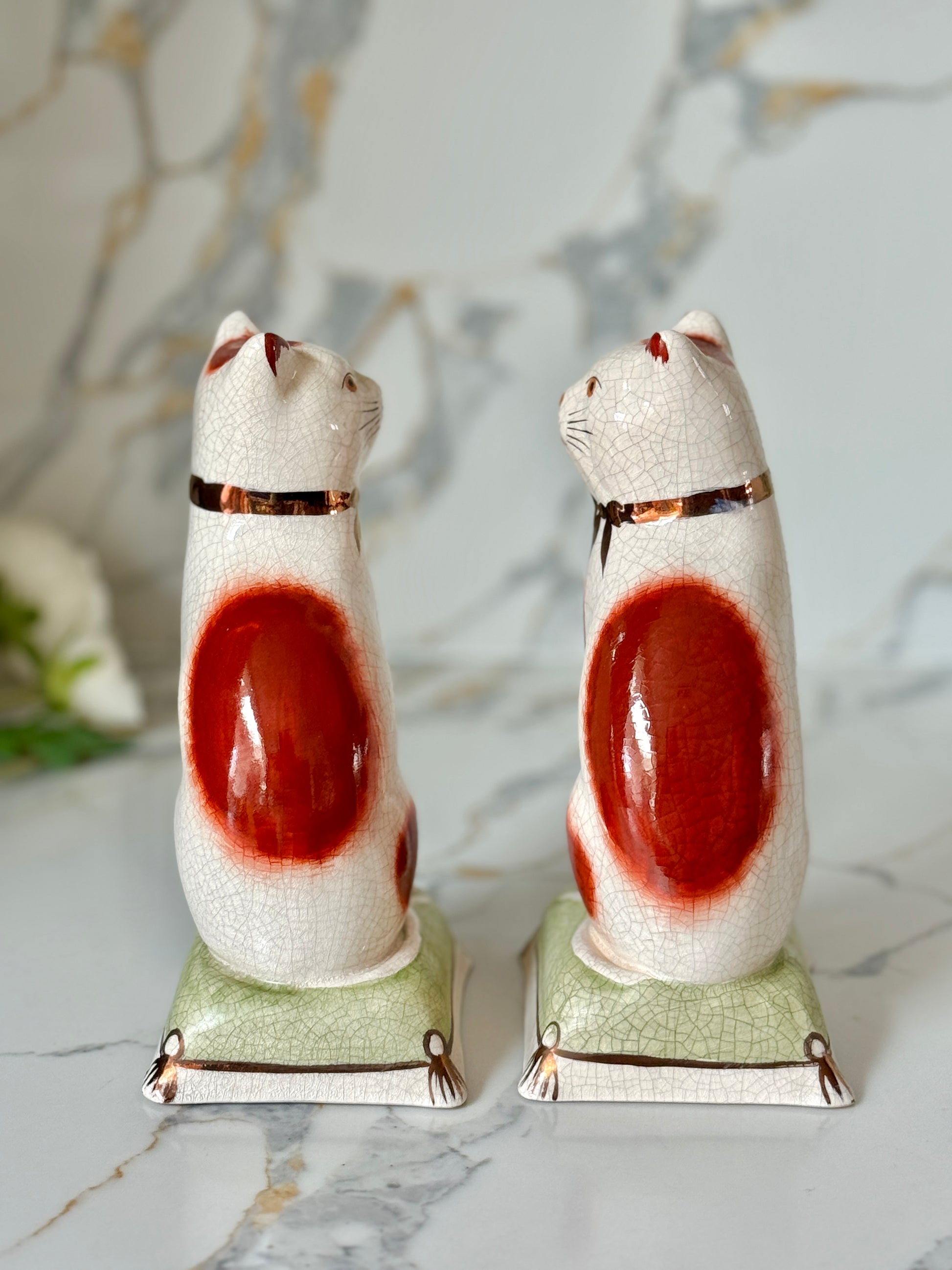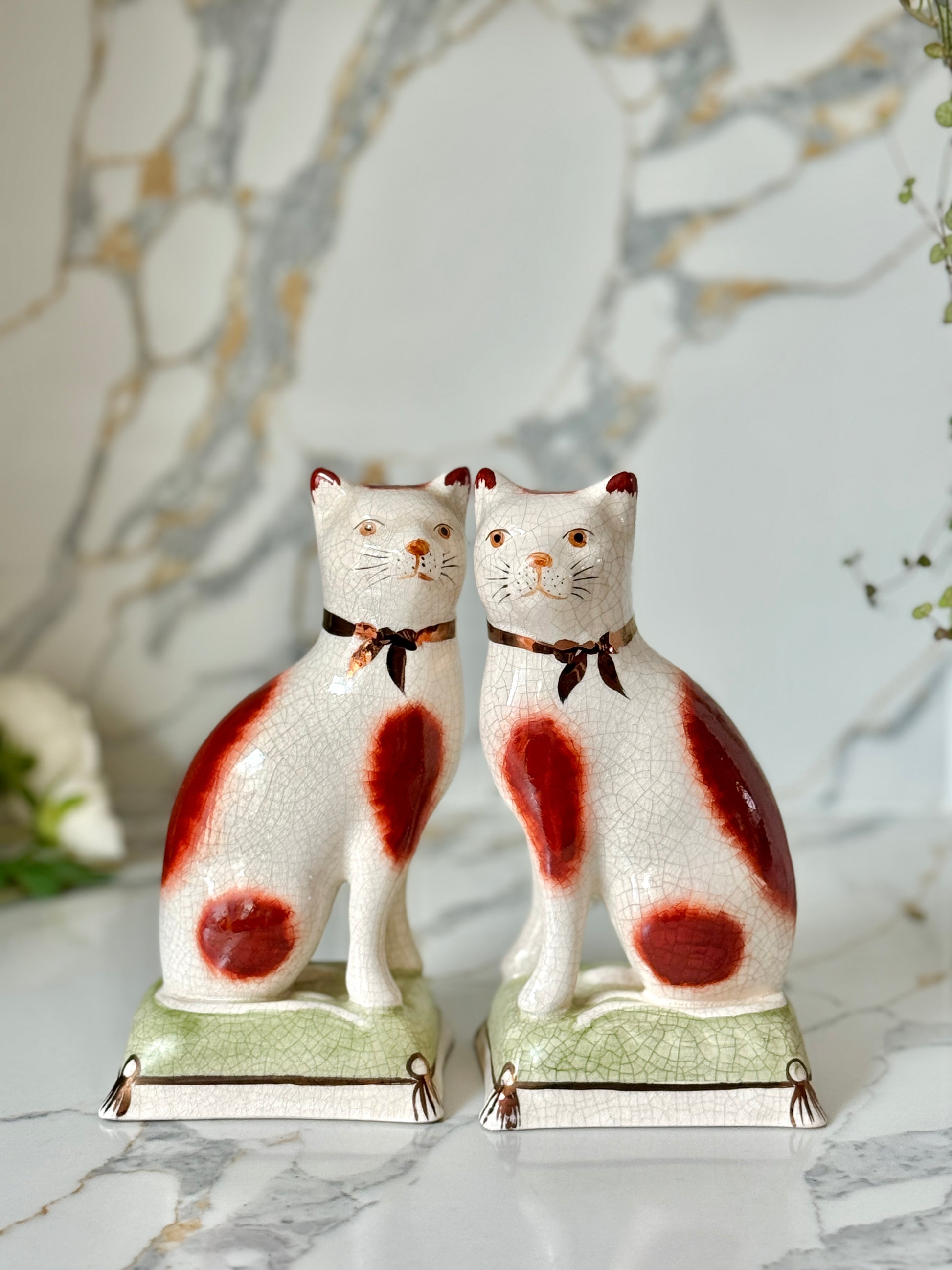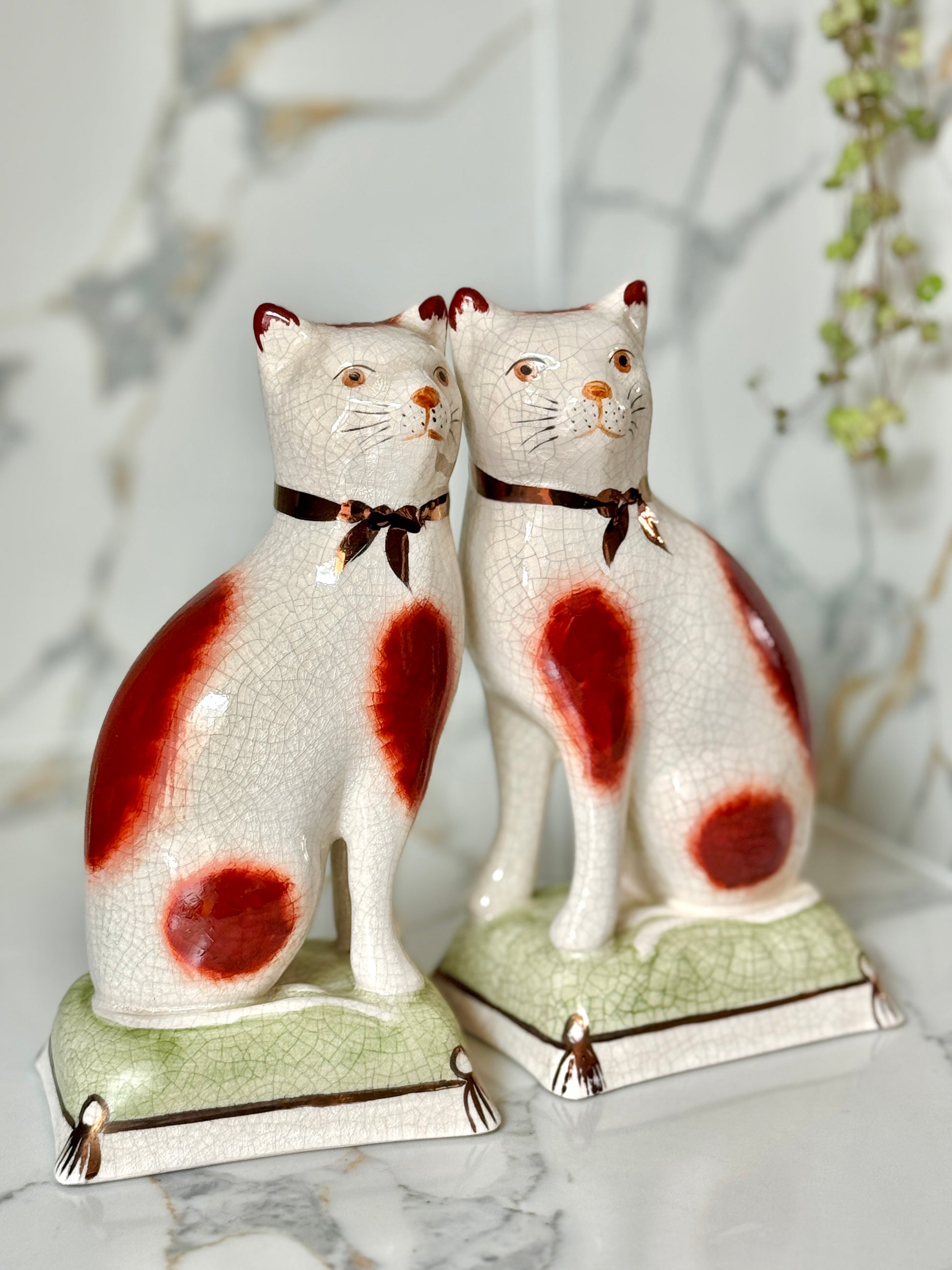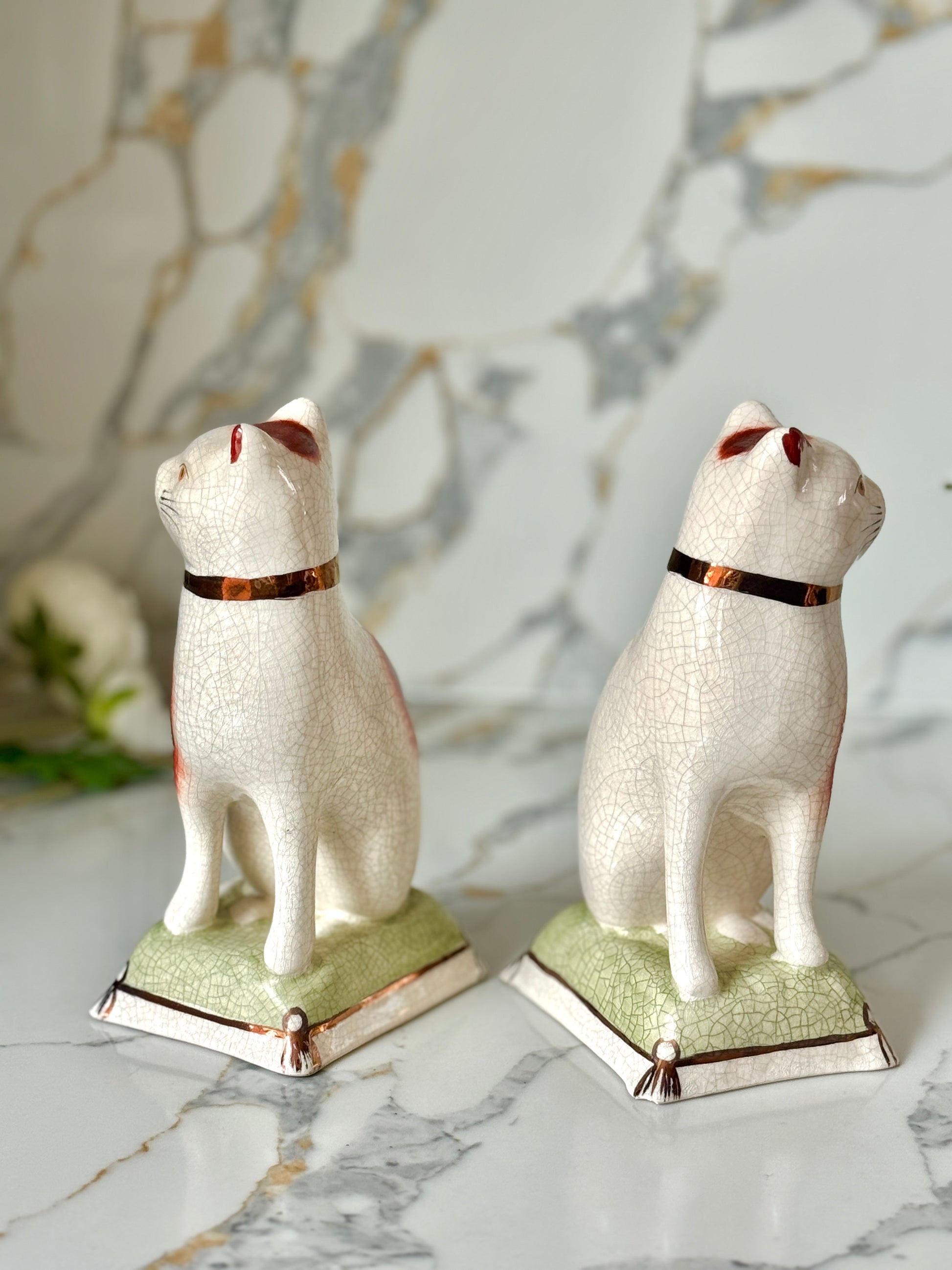 ウィリアム・ケント社は、1894年創業の英国陶磁器ブランドで、スタッフォードシャードッグやキャットなど、アニマルフィギュリンの高品質な復刻で知られています。同じ型から生まれた作品でも、それぞれに個性と表情があり、そこがヴィンテージの大きな魅力です。今回のペアは上品な艶感と、柔らかな色調が美しく、グリーンのクッション台座が空間に落ち着いたアクセントを添えてくれます。