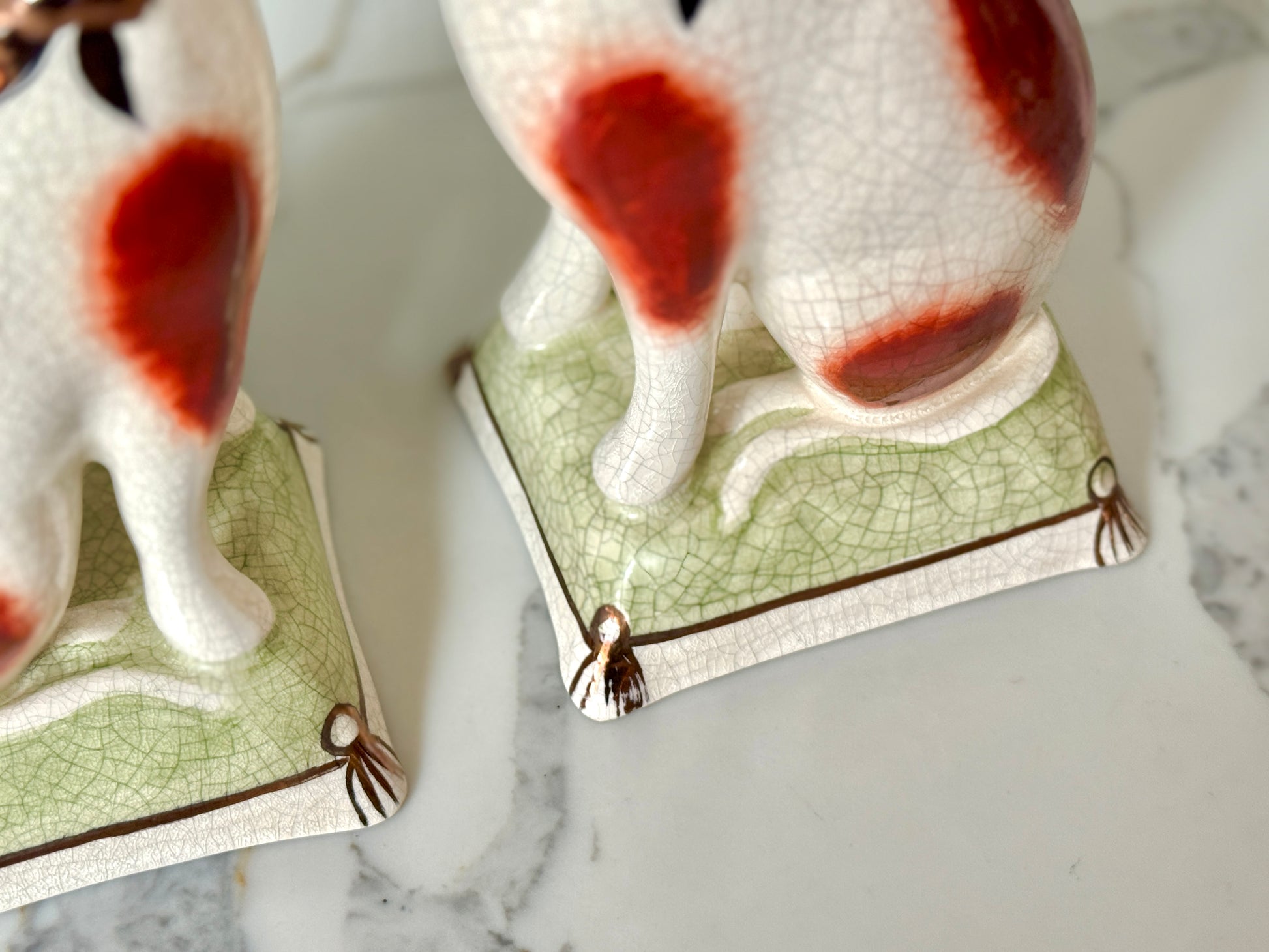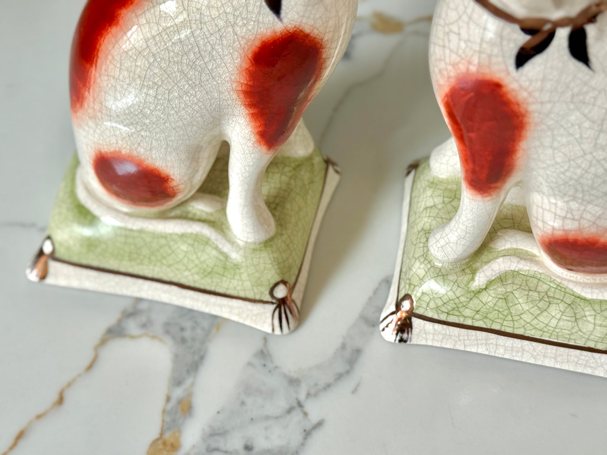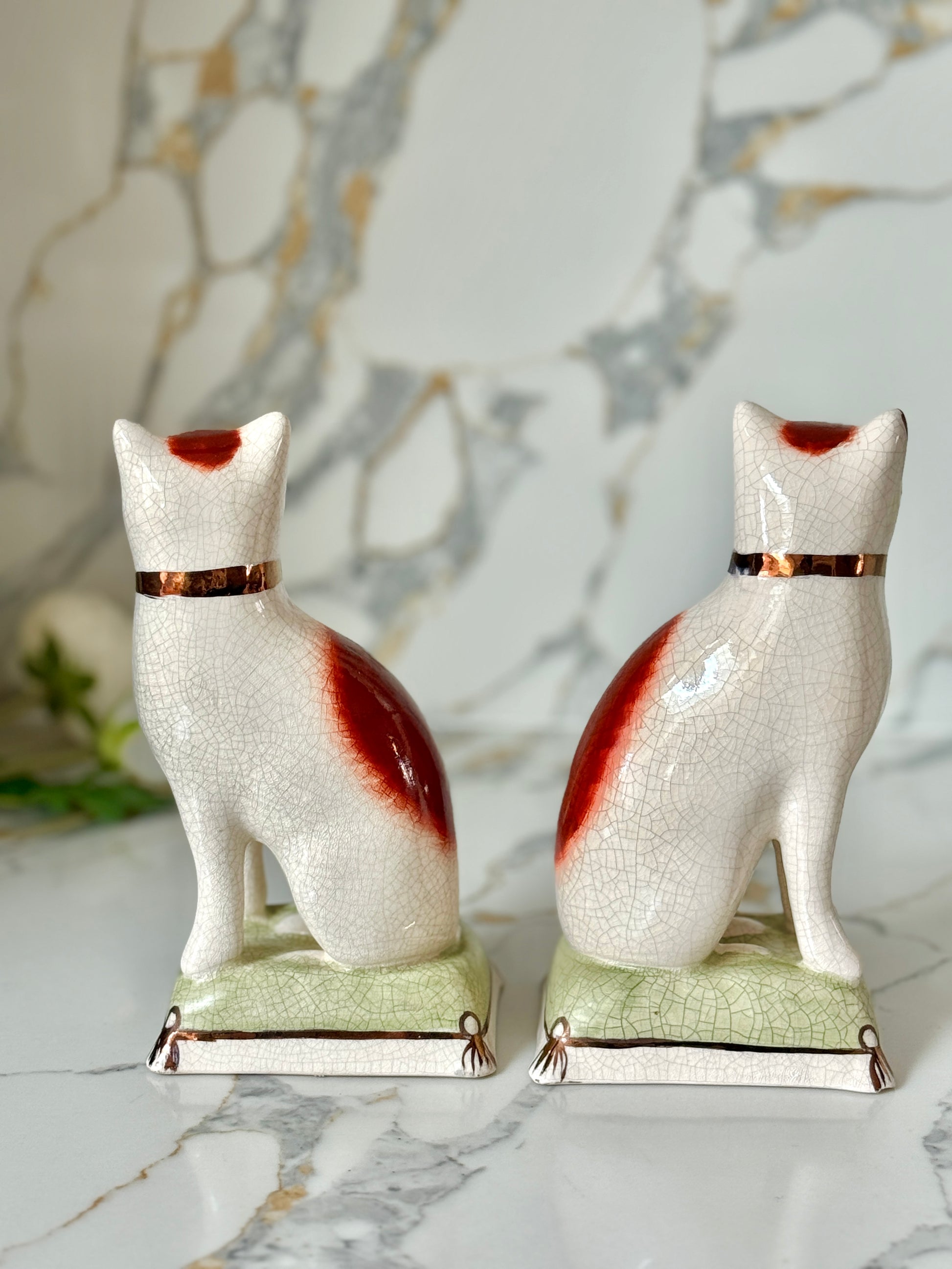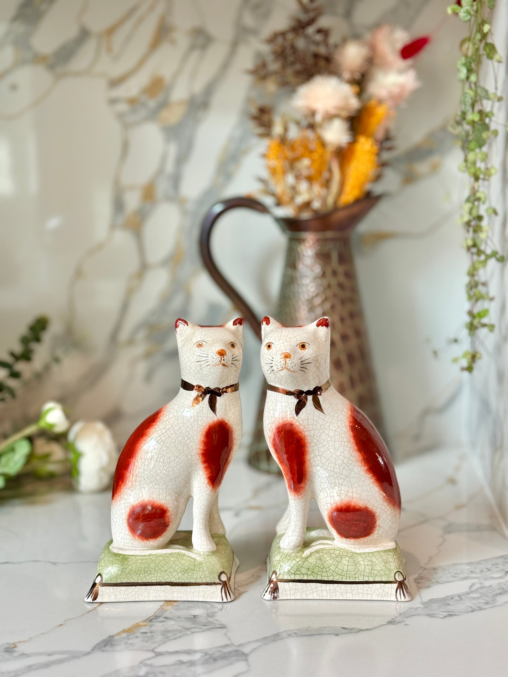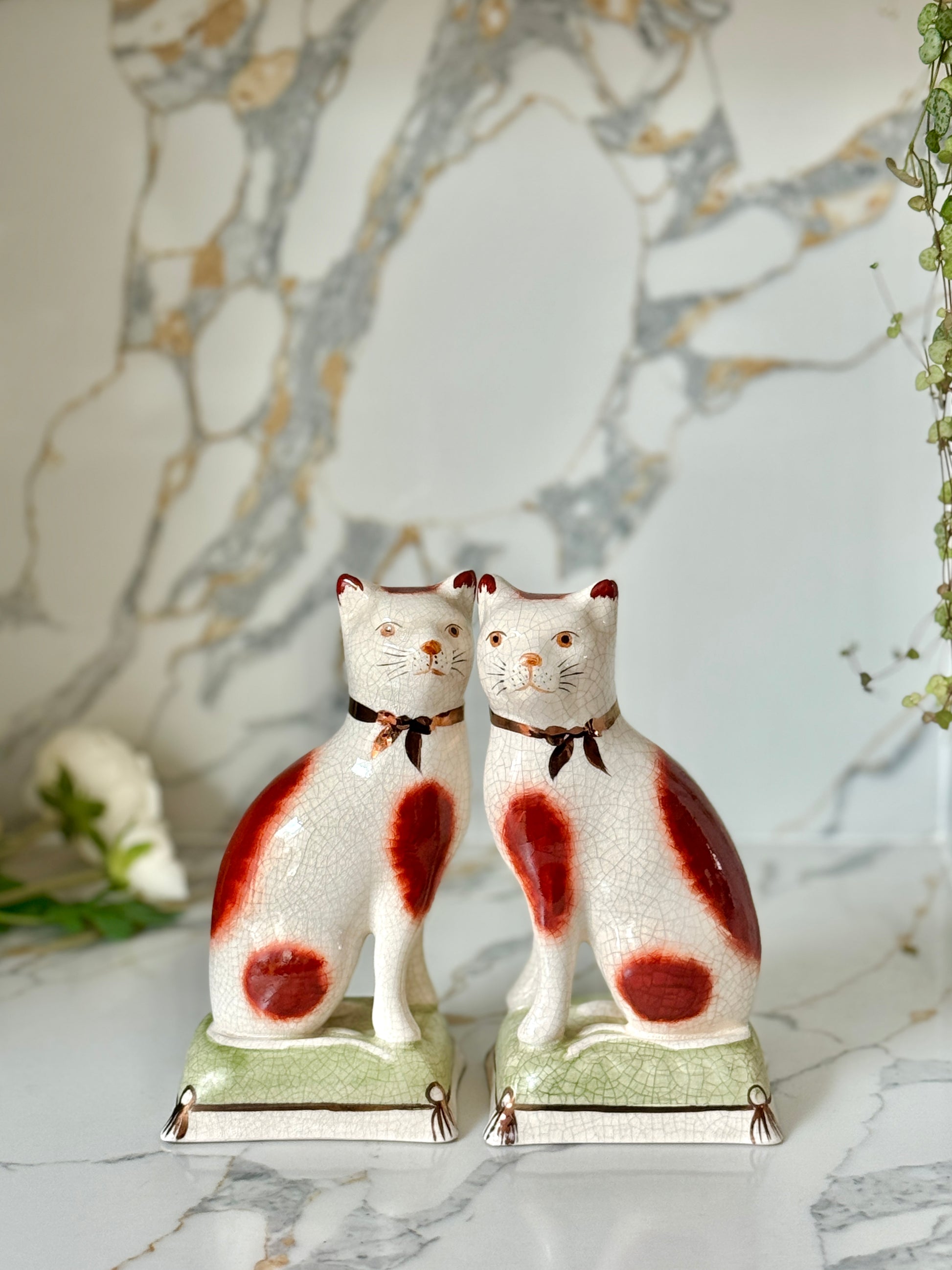 ウィリアム・ケント社は、1894年創業の英国陶磁器ブランドで、スタッフォードシャードッグやキャットなど、アニマルフィギュリンの高品質な復刻で知られています。同じ型から生まれた作品でも、それぞれに個性と表情があり、そこがヴィンテージの大きな魅力です。今回のペアは上品な艶感と、柔らかな色調が美しく、グリーンのクッション台座が空間に落ち着いたアクセントを添えてくれます。