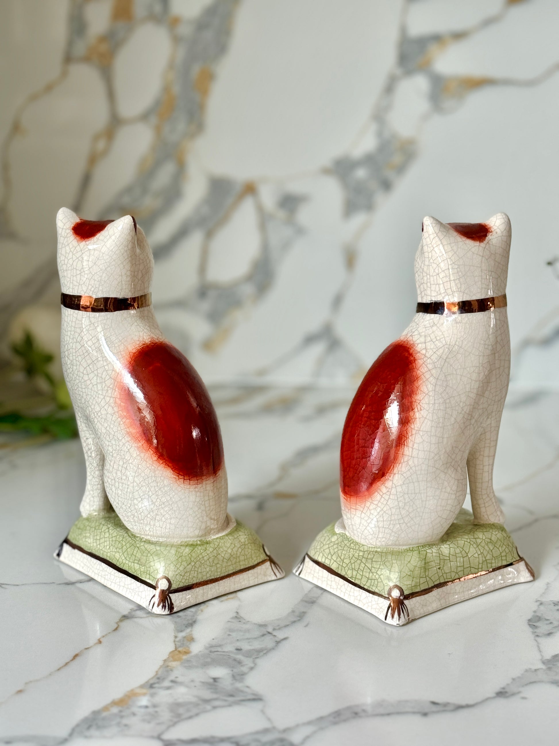 ウィリアム・ケント社、スタッフォードシャーキャットのペア | 赤茶色の柄 & グリーンクッション、C.1950年代