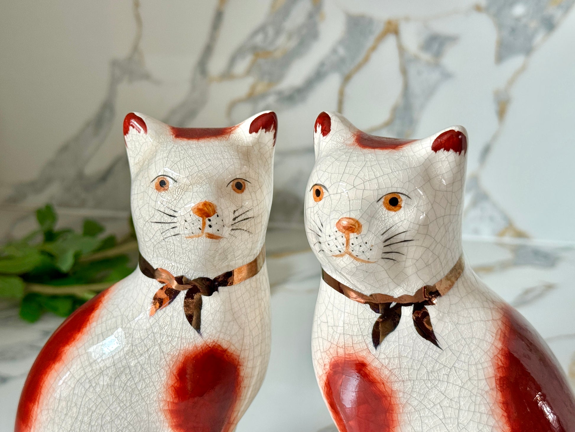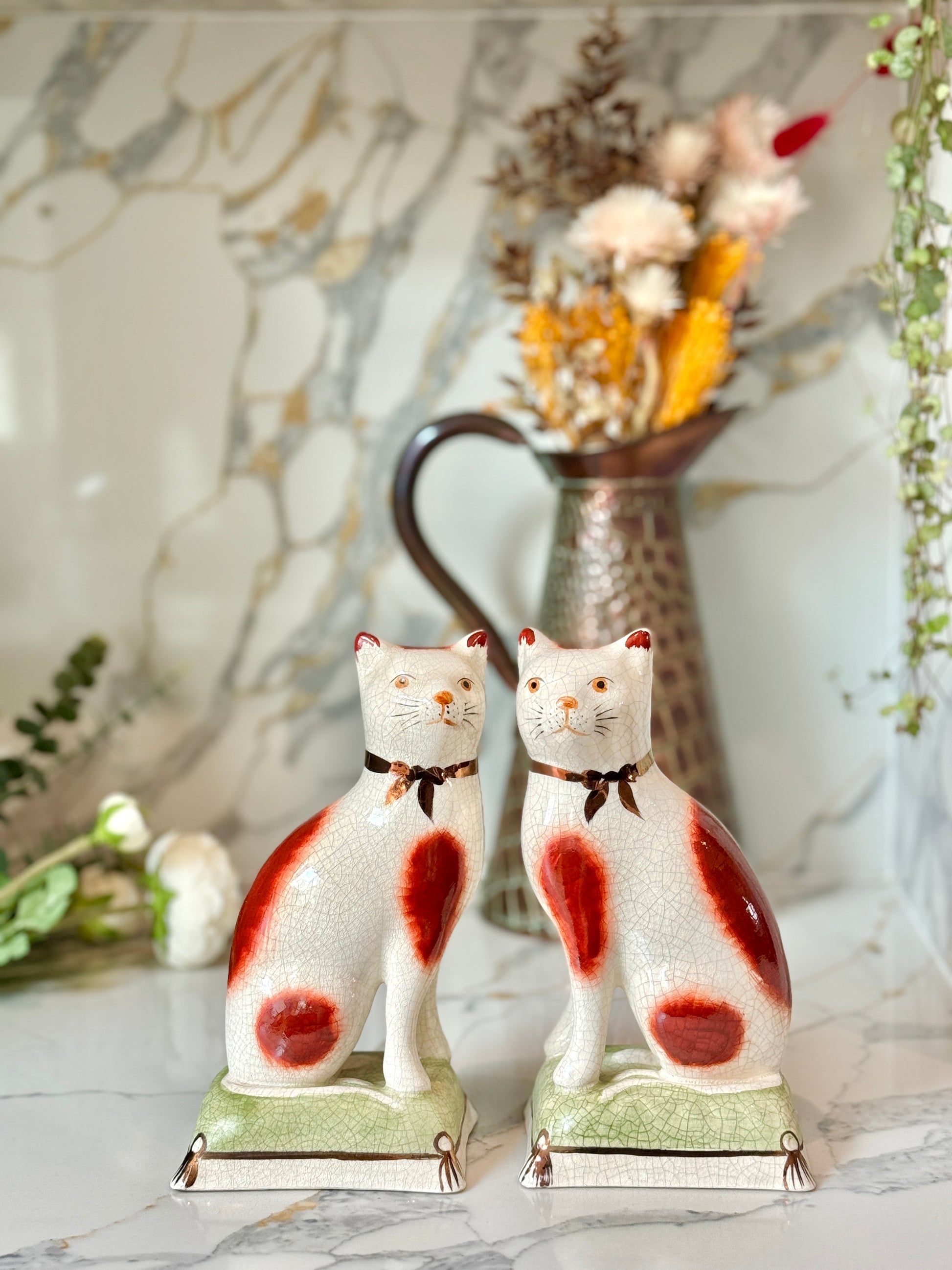 こちらは、ウィリアム・ケント(William Kent)によるヴィンテージのスタッフォードシャーキャットのペアです。1950年代頃に製作されたもので、白いボディにあたたかみのあるレッドブラウンのパッチが映える、クラシックな魅力あふれる一対です。高さ約20センチと大きめで、どこか誇らしげで穏やかな表情が愛らしく、見るたびに心がほっと和むような存在感があります。