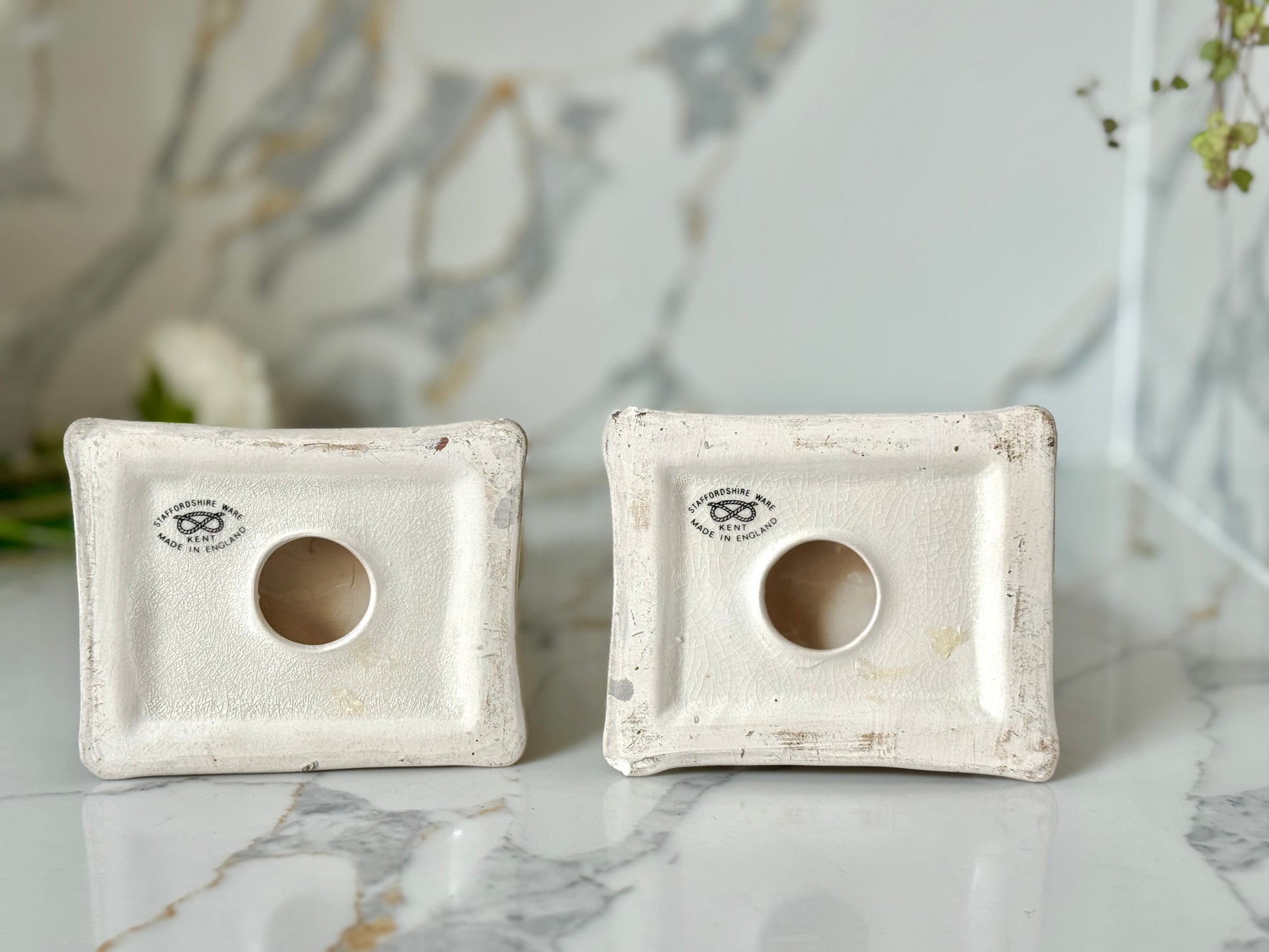 底面には「Staffordshire Ware Kent Made in England」とスタッフォードシャーノットのバックスタンプが入り、正統なケント作品であることが確認できます。なお、1960年代初頭に同社が閉窯した後、複数の成形型が小規模工房に引き継がれたことで、現在市場には無印の類似作品も見られますが、こちらはバックスタンプ入りの確かなペアです。