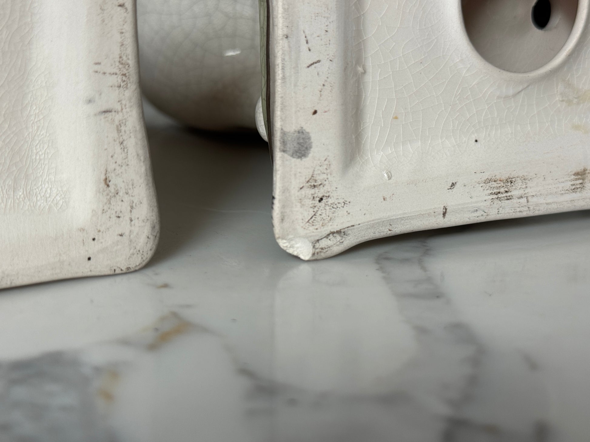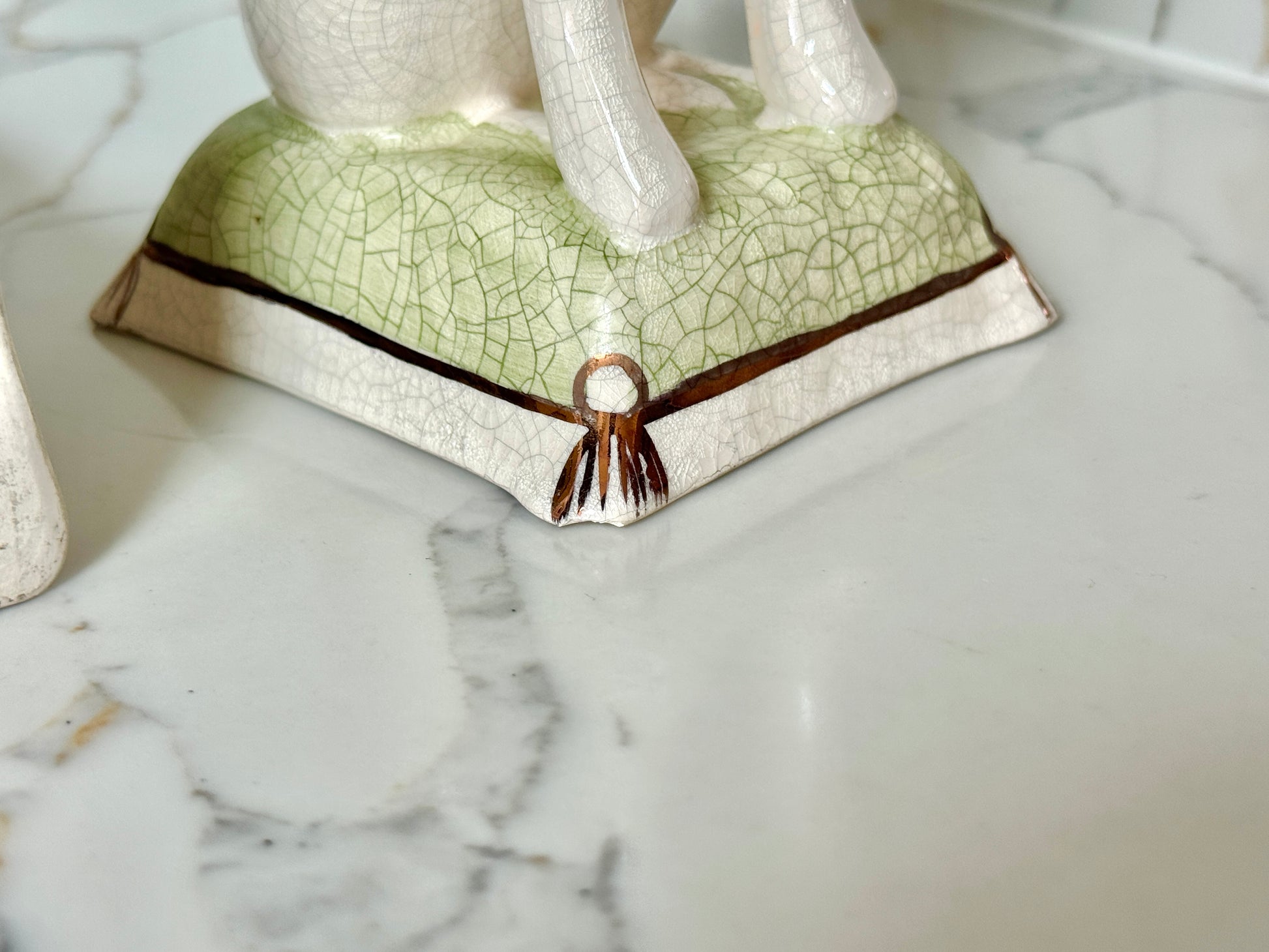 ヴィンテージ品として大変良好な状態です。釉薬の艶やかさや色の深みもきれいに残っています。1匹の台座の角の裏側にごく小さなチップが見られますが、ディスプレイ時にはほとんど気にならない程度です。