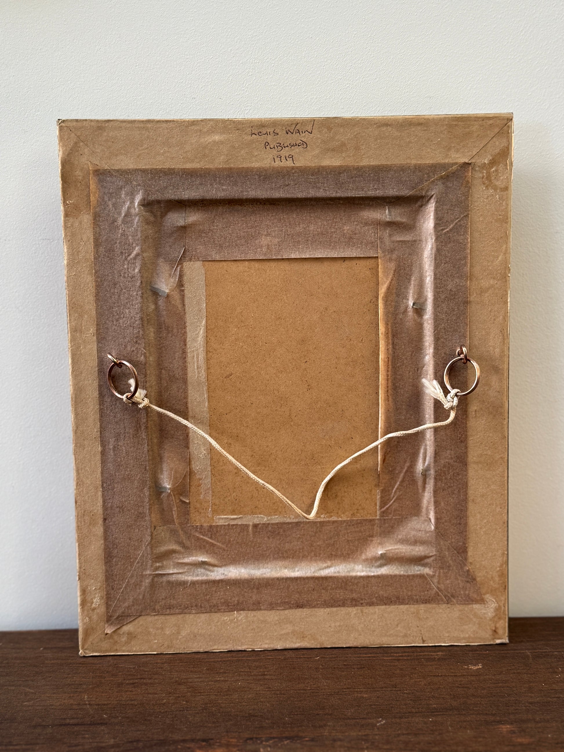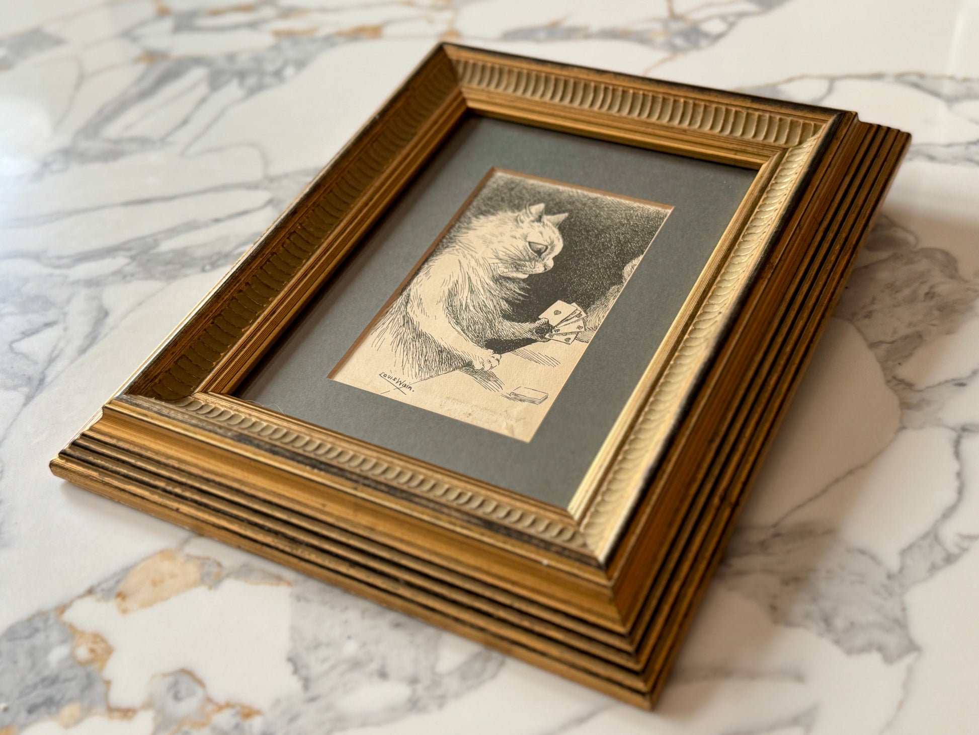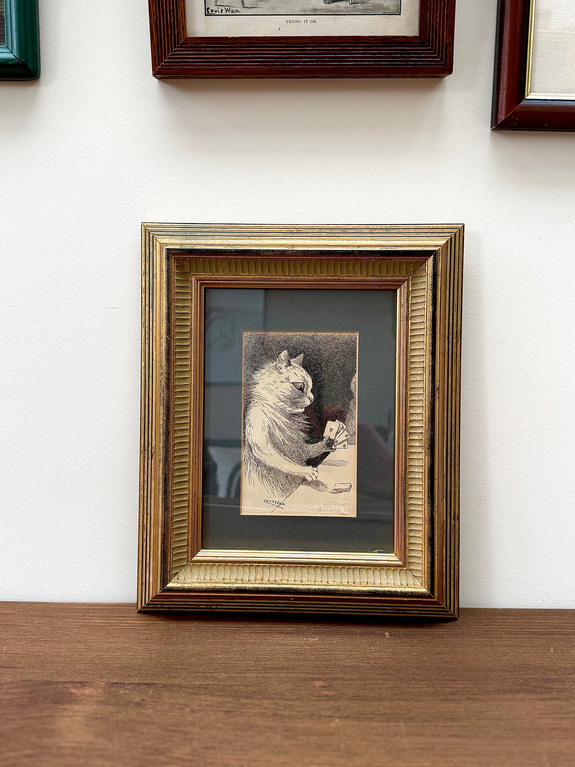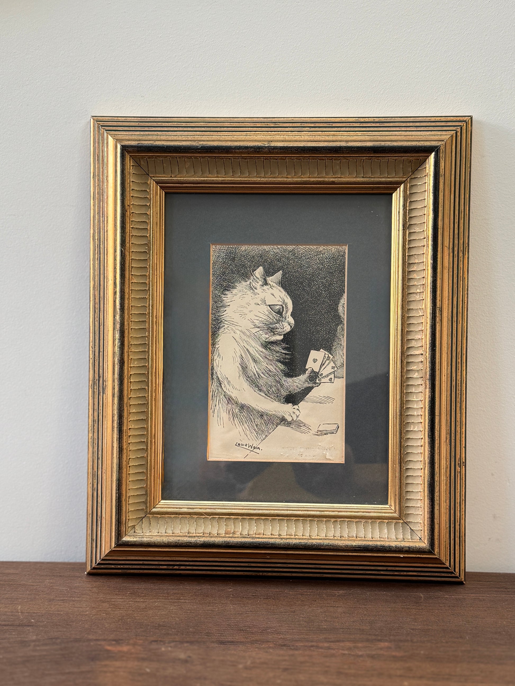 A charming black-and-white print of a cat playing cards, published in 1919 and attributed to the beloved British illustrator Louis Wain. The expressive cat character and humorous composition capture the wit and warmth that made Wain’s work so well loved in early twentieth-century England.