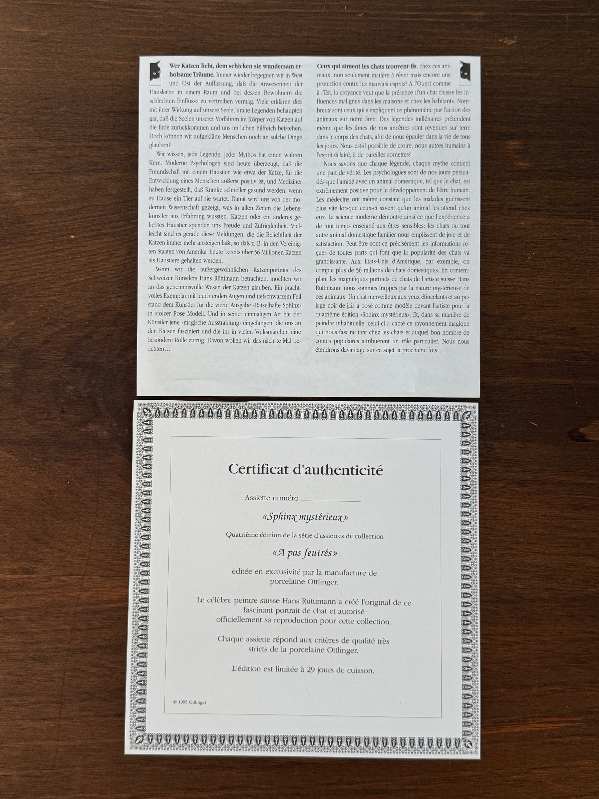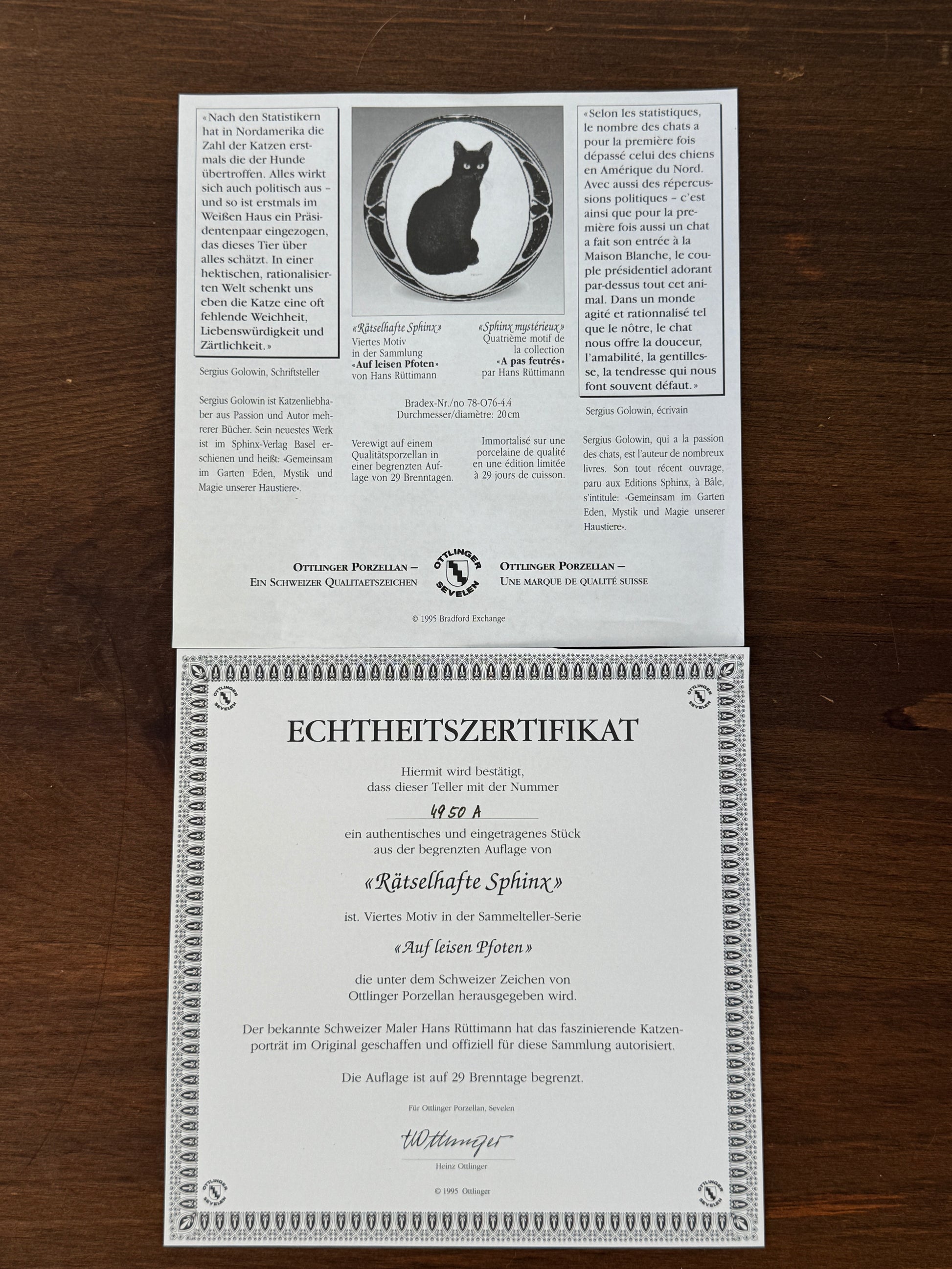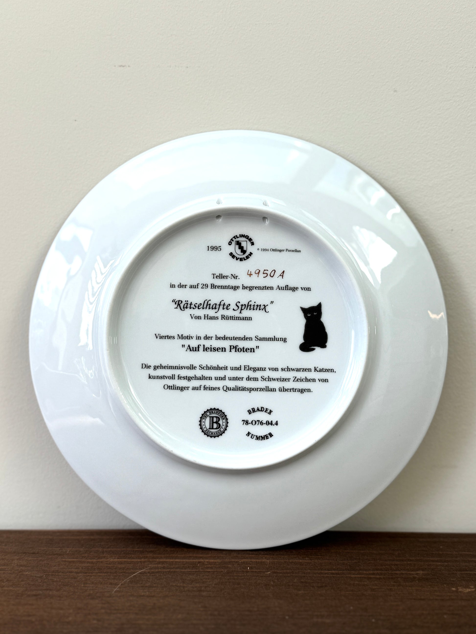 A collectible wall plate featuring a black cat titled ‘ Rätselhafte Sphinx (Mysterious Sphinx)’ from the On Quiet Paws series by Swiss artist Hans Ruttimann, produced by Ottlinger Sevelen, Switzerland, exclusively for The Bradford Exchange in 1995. The series celebrates the graceful beauty and mysterious charm of black cats, each design capturing a unique expression and personality.